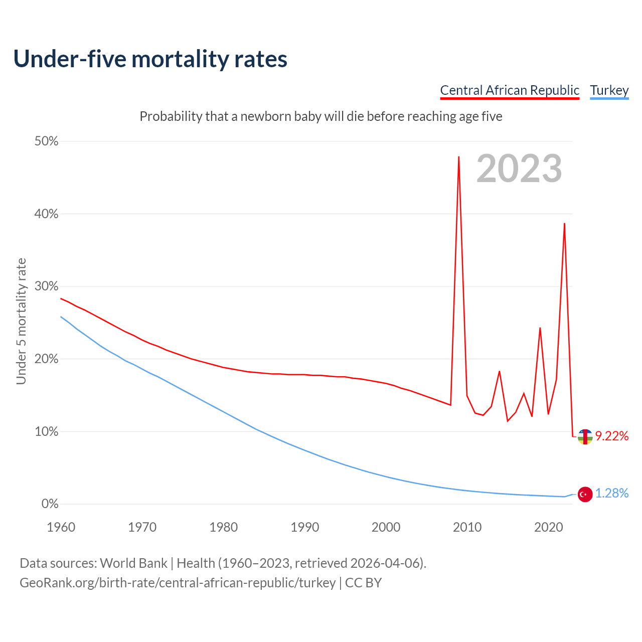 The chance that a newborn baby will die before reaching age five is 9.22% in the Central African Republic and 1.28% in Turkey. Above is a chart with historical data on under-five mortality rates.