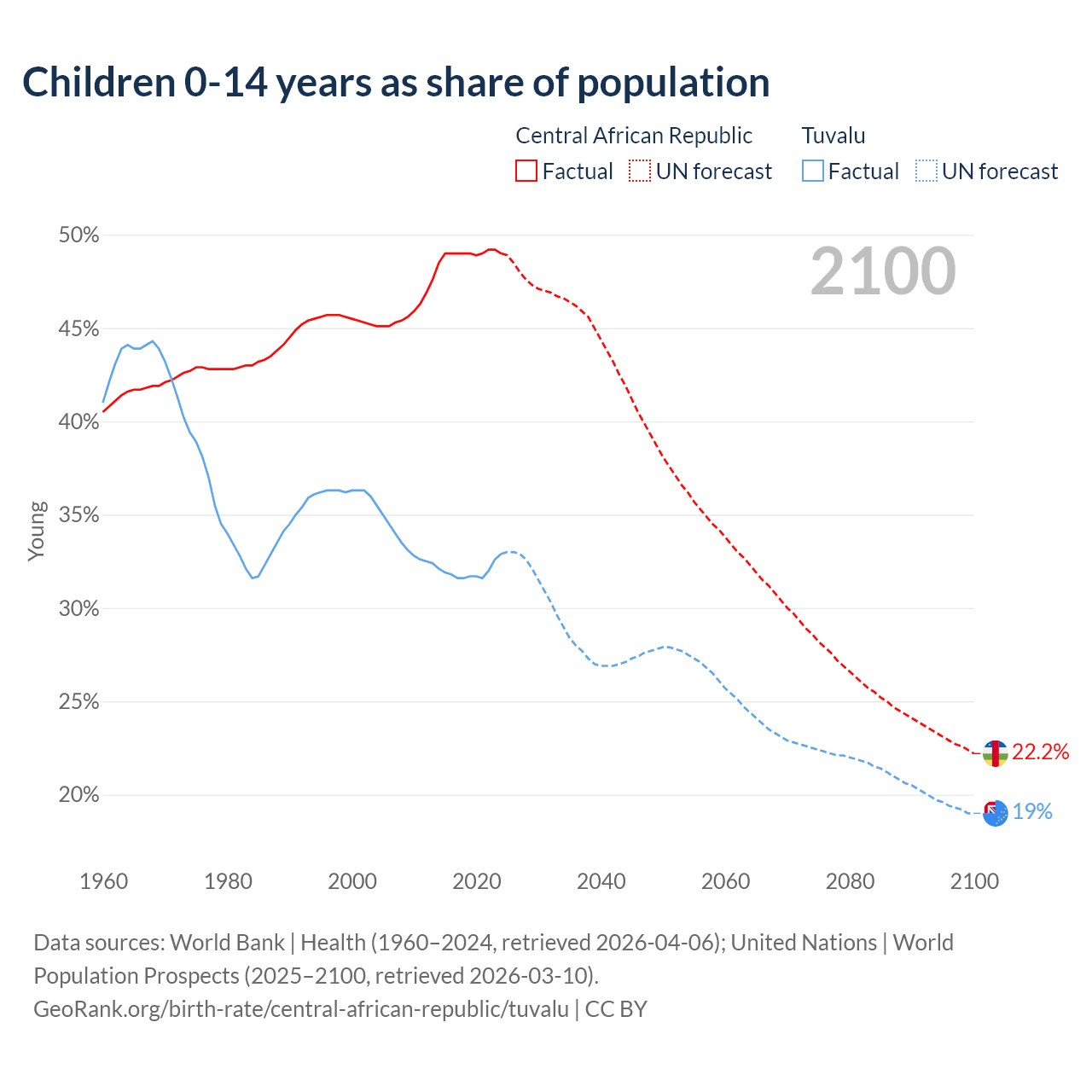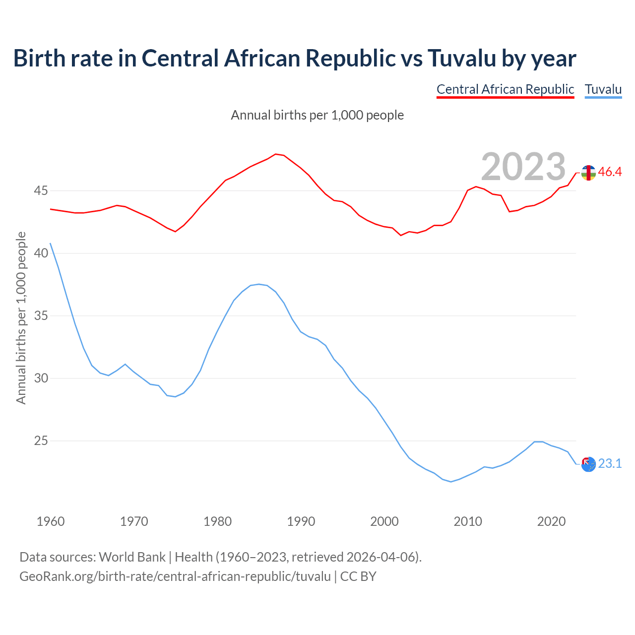 The Central African Republic has an annual birth rate of 46.4 births per 1,000 people, compared to 23.1 for Tuvalu. The average number of children a woman is expected to have during her lifetime — the fertility rate, is 6.01 in the Central African Republic and 3.21 in Tuvalu — 46.6% difference.