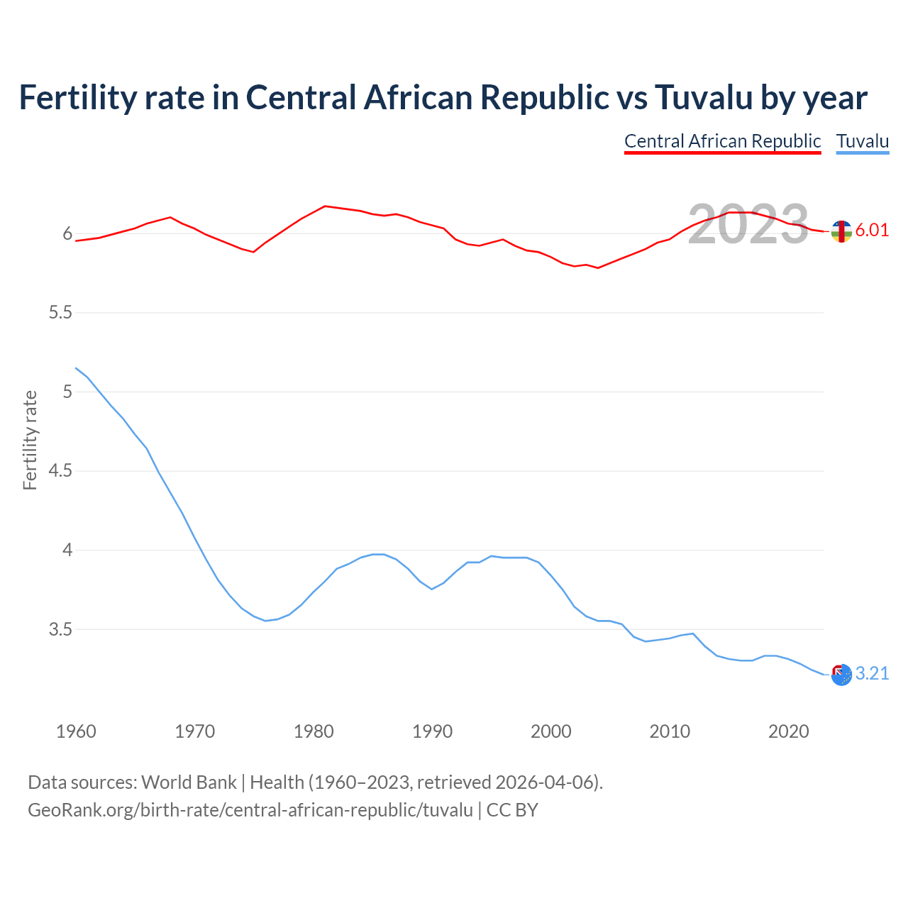 According to the latest available data on birth rates, the fertility rate in the Central African Republic was 6.01 children per woman in 2023, compared to 3.21 in Tuvalu in 2023. The replacement level is considered to be 2.1 children per woman.
