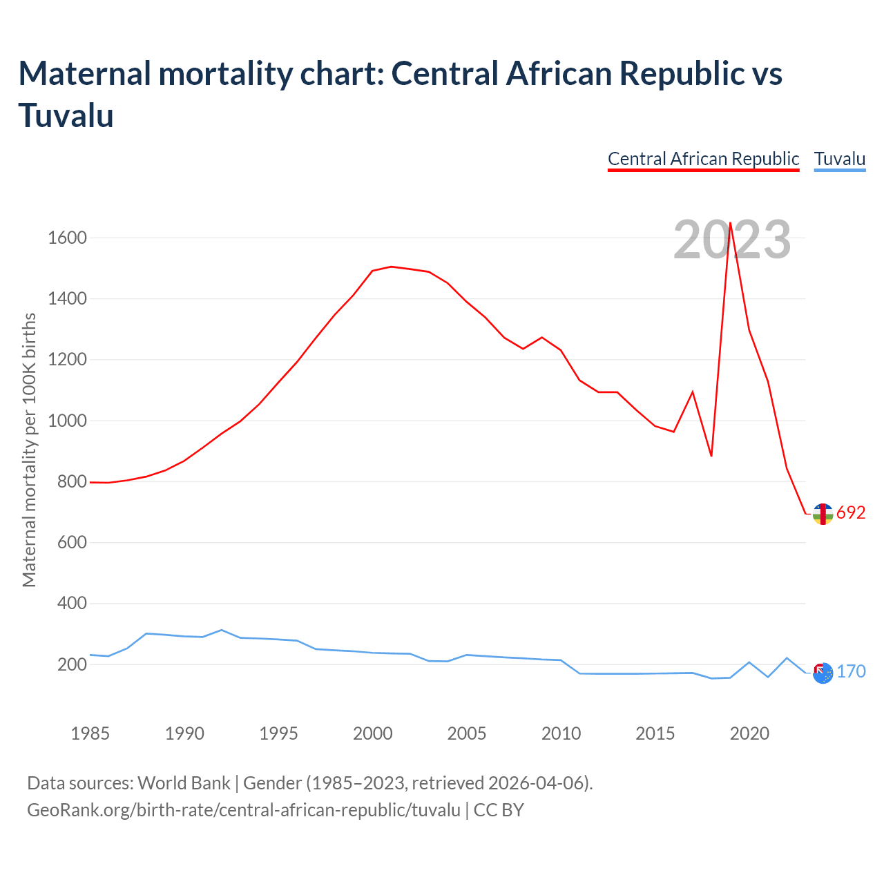 The maternal mortality rate, which is the probability of dying during childbirth or within 42 days of pregnancy termination, is 692 deaths per 100,000 live births in the Central African Republic, compared to 170 deaths in Tuvalu.