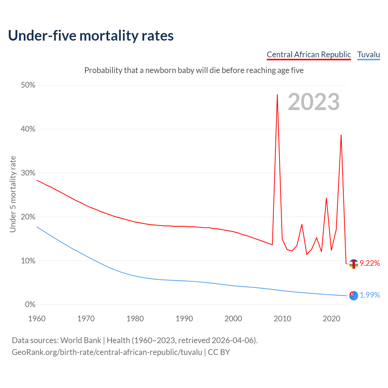 The chance that a newborn baby will die before reaching age five is 9.22% in the Central African Republic and 1.99% in Tuvalu. Above is a chart with historical data on under-five mortality rates.