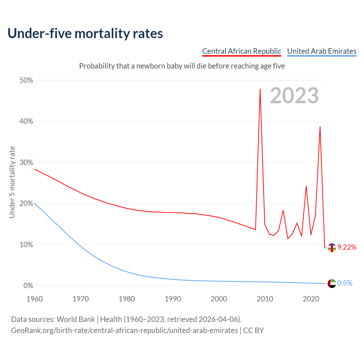 The chance that a newborn baby will die before reaching age five is 9.22% in the Central African Republic and 0.5% in the United Arab Emirates. Above is a chart with historical data on under-five mortality rates.