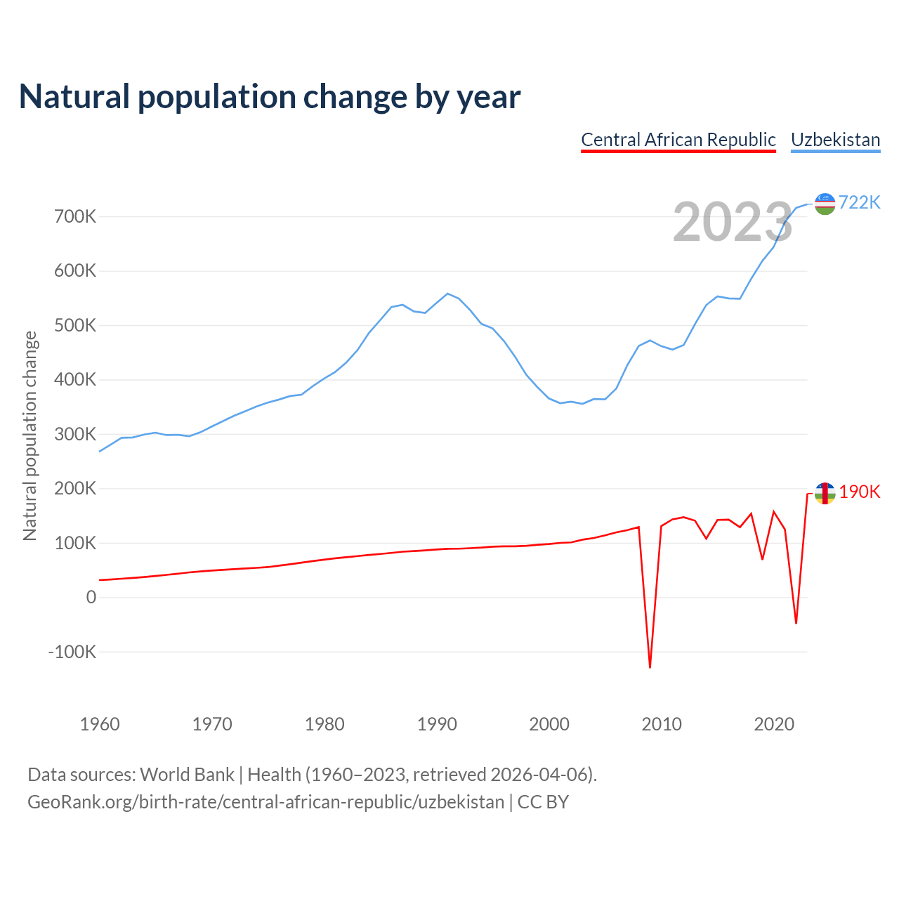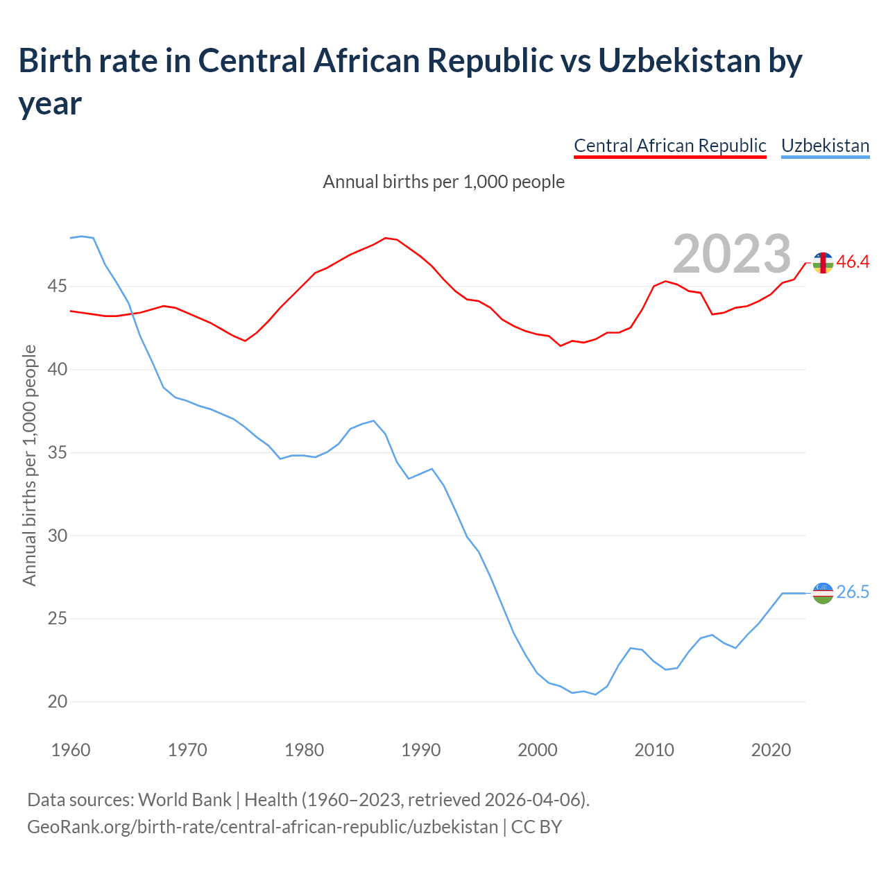 The Central African Republic has an annual birth rate of 46.4 births per 1,000 people, compared to 26.5 for Uzbekistan. The average number of children a woman is expected to have during her lifetime — the fertility rate, is 6.01 in the Central African Republic and 3.5 in Uzbekistan — 41.8% difference.