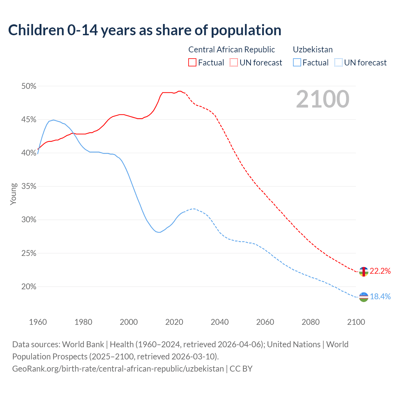 According to the latest available data on birth rates, the fertility rate in the Central African Republic was 6.01 children per woman in 2023, compared to 3.5 in Uzbekistan in 2023. The replacement level is considered to be 2.1 children per woman.
