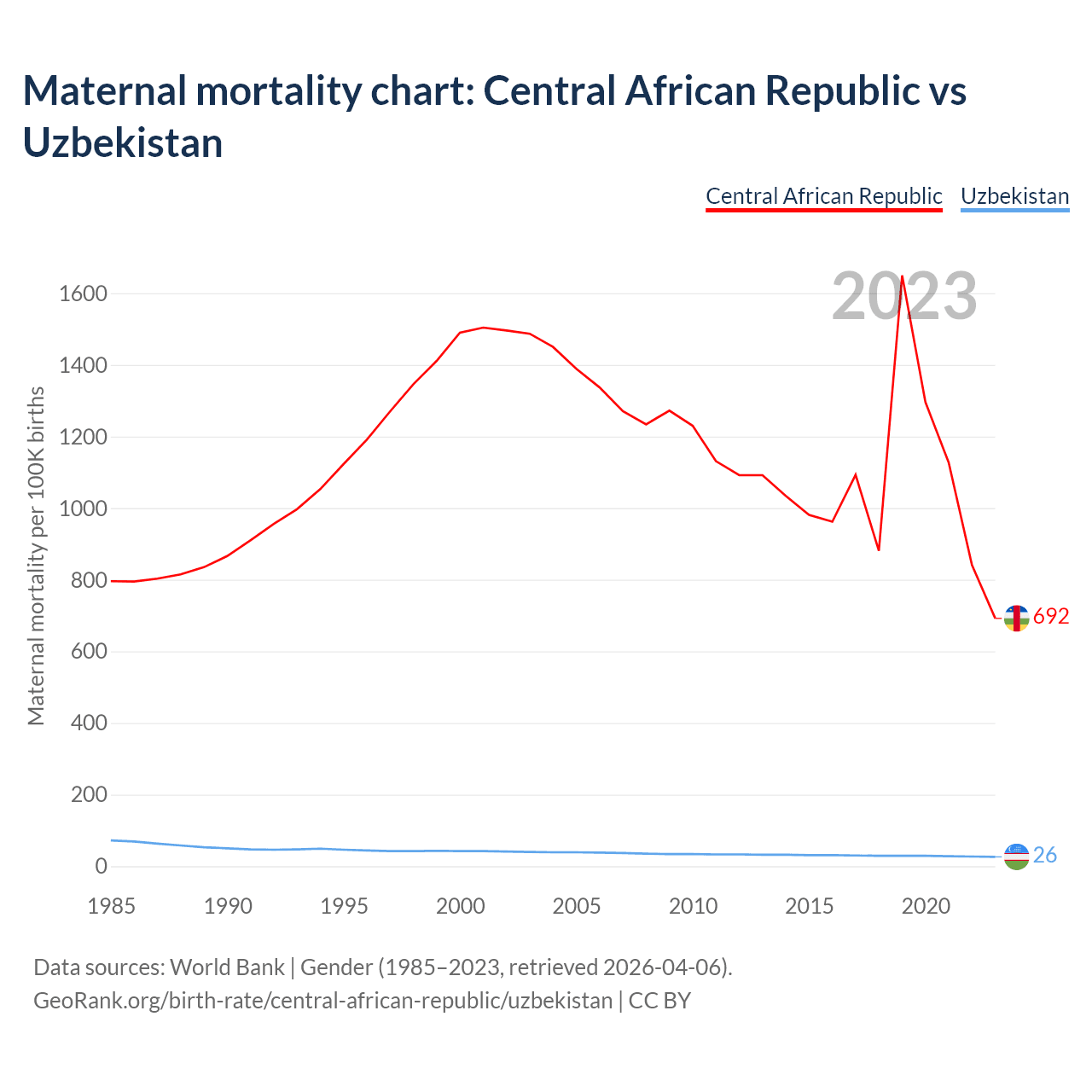 The maternal mortality rate, which is the probability of dying during childbirth or within 42 days of pregnancy termination, is 692 deaths per 100,000 live births in the Central African Republic, compared to 26 deaths in Uzbekistan.