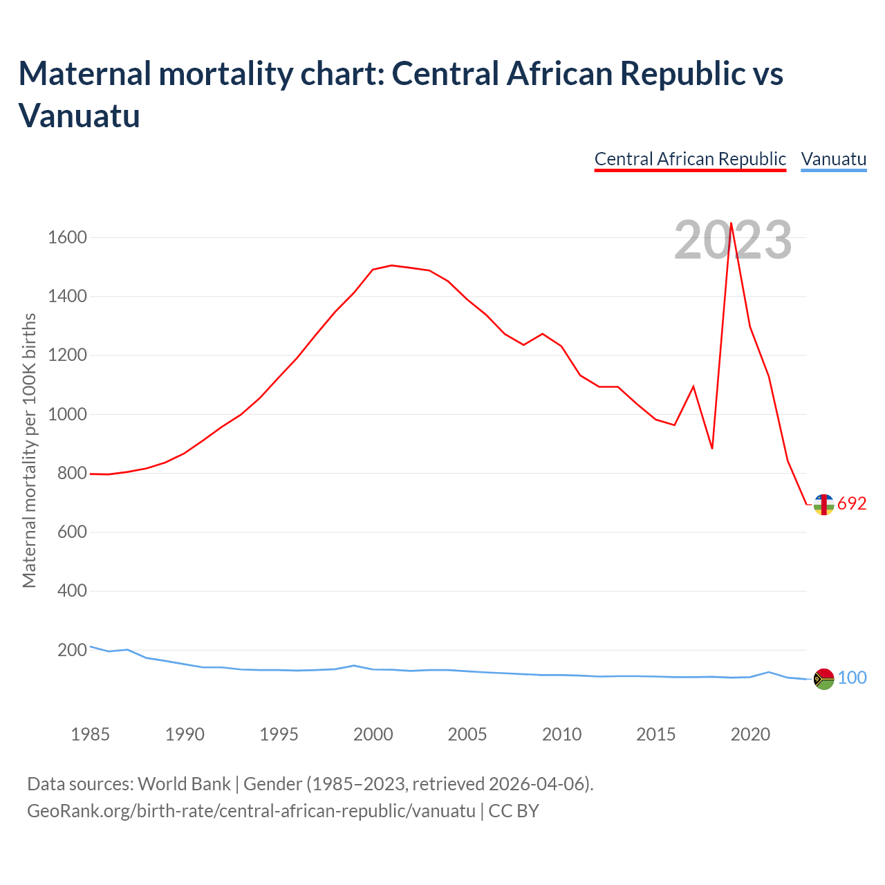 The maternal mortality rate, which is the probability of dying during childbirth or within 42 days of pregnancy termination, is 692 deaths per 100,000 live births in the Central African Republic, compared to 100 deaths in Vanuatu.