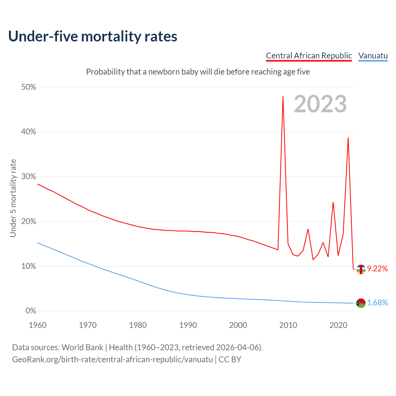 The chance that a newborn baby will die before reaching age five is 9.22% in the Central African Republic and 1.68% in Vanuatu. Above is a chart with historical data on under-five mortality rates.