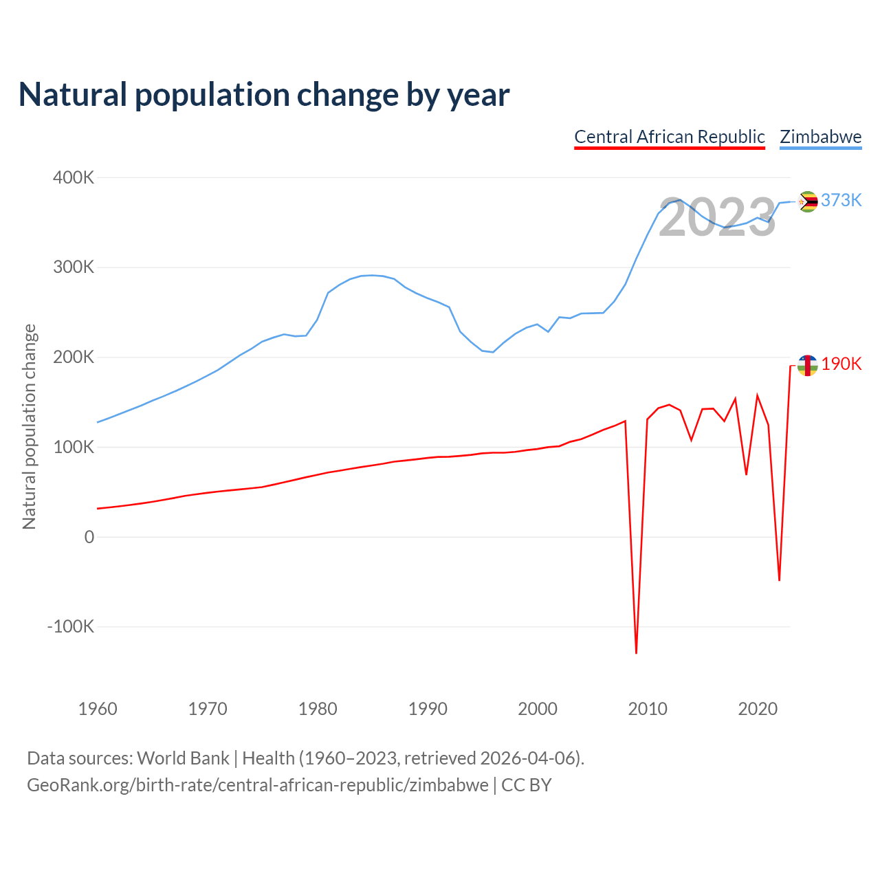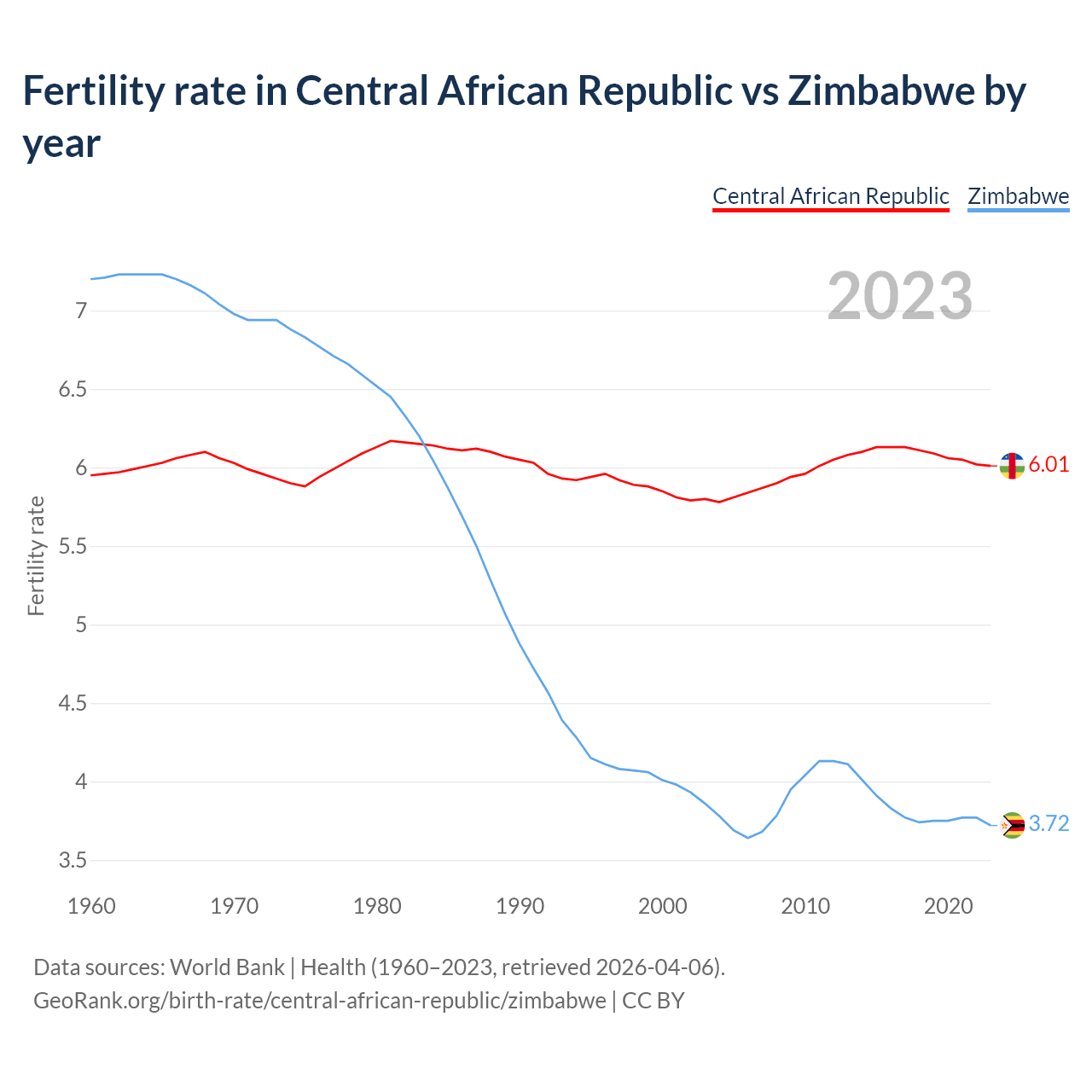 1960 vs 2023, the fertility rate has changed by +1.08% in the Central African Republic and by 48.2% in Zimbabwe — in 1960, it was 5.95 and 7.2, respectively.