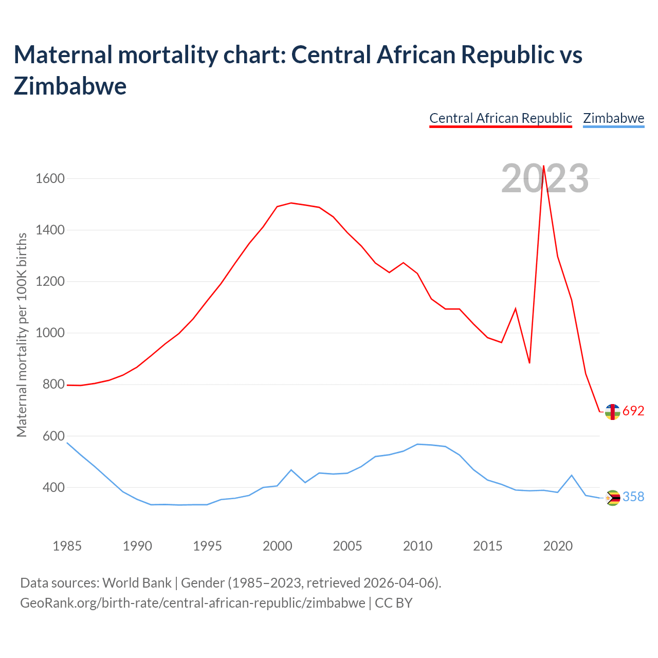 The maternal mortality rate, which is the probability of dying during childbirth or within 42 days of pregnancy termination, is 692 deaths per 100,000 live births in the Central African Republic, compared to 358 deaths in Zimbabwe.