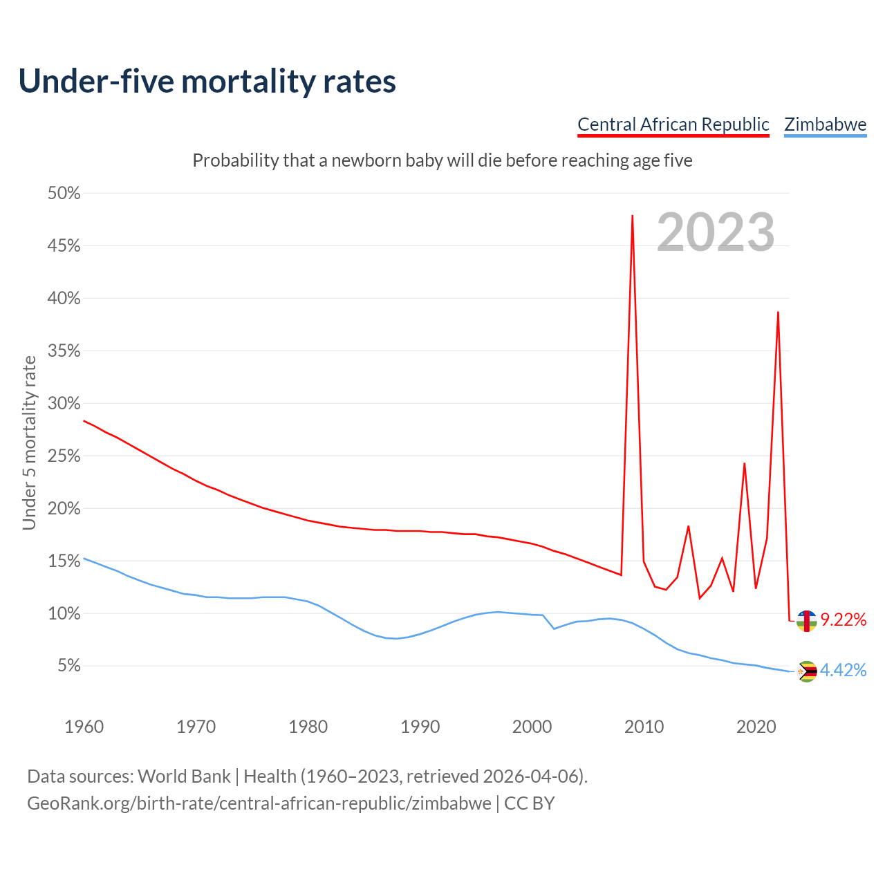The chance that a newborn baby will die before reaching age five is 9.22% in the Central African Republic and 4.42% in Zimbabwe. Above is a chart with historical data on under-five mortality rates.