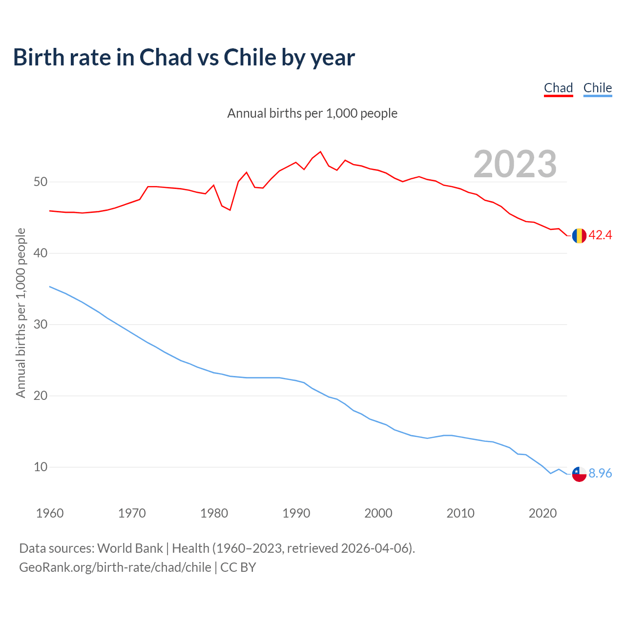 Chad has an annual birth rate of 42.4 births per 1,000 people, compared to 8.96 for Chile. The average number of children a woman is expected to have during her lifetime — the fertility rate, is 6.12 in Chad and 1.17 in Chile — 80.9% difference.