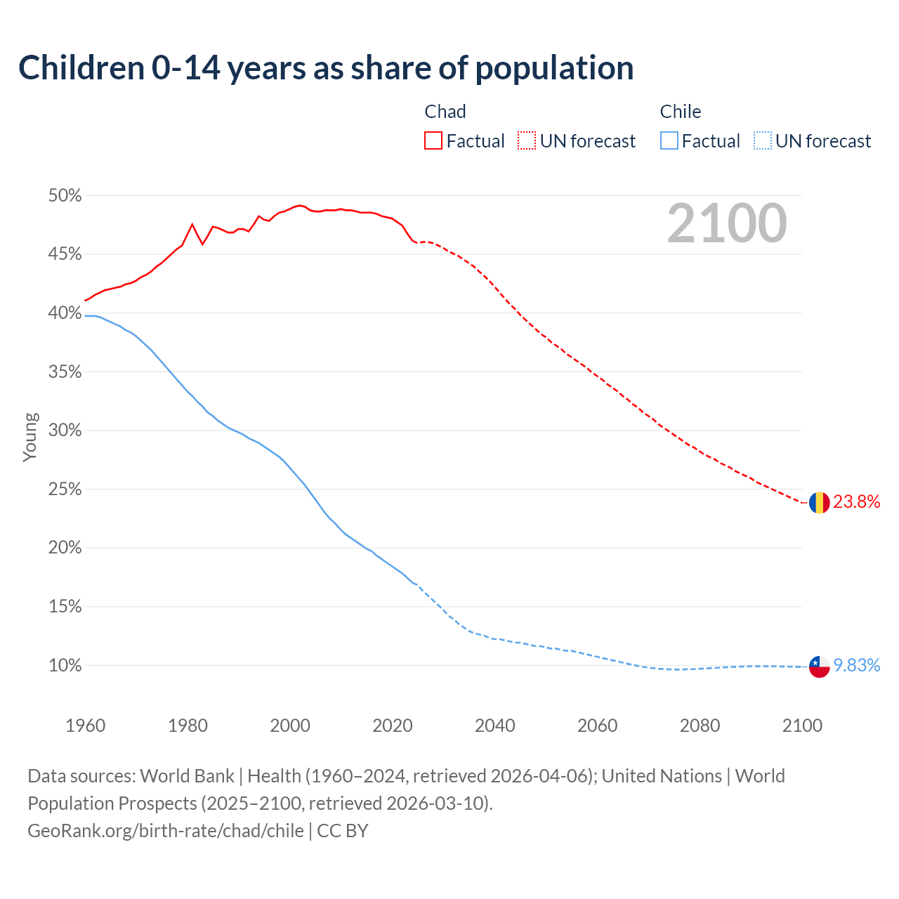 According to the latest available data on birth rates, the fertility rate in Chad was 6.12 children per woman in 2023, compared to 1.17 in Chile in 2023. The replacement level is considered to be 2.1 children per woman.