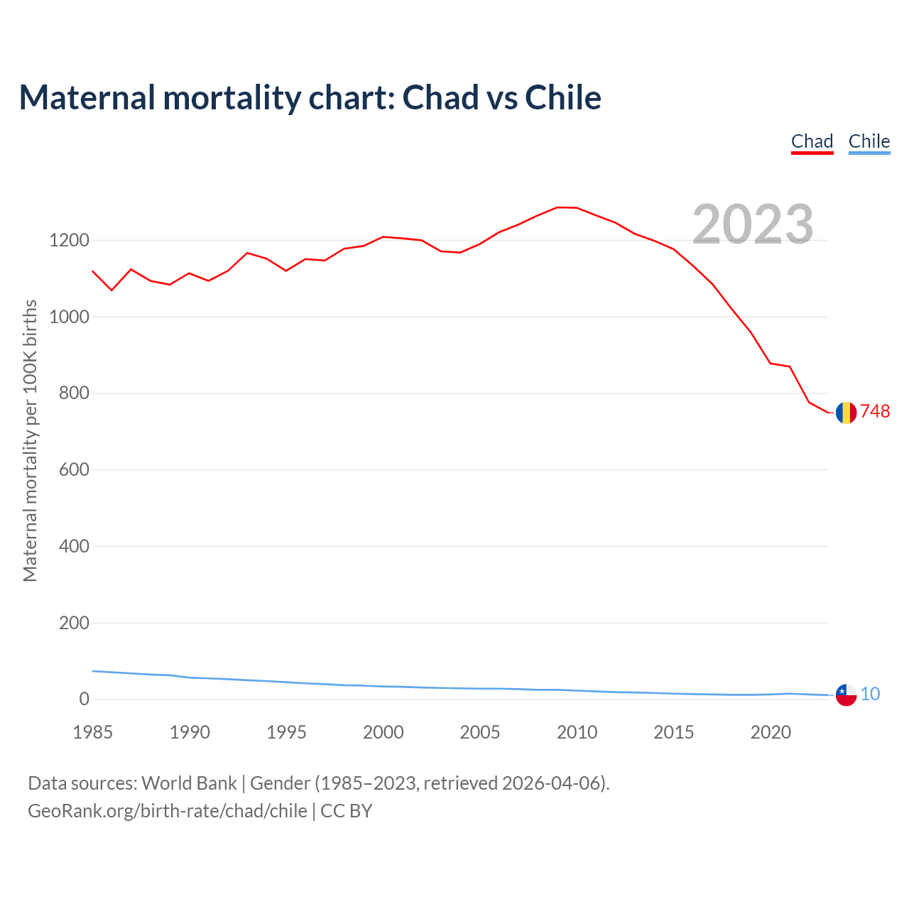 The maternal mortality rate, which is the probability of dying during childbirth or within 42 days of pregnancy termination, is 748 deaths per 100,000 live births in Chad, compared to 10 deaths in Chile.