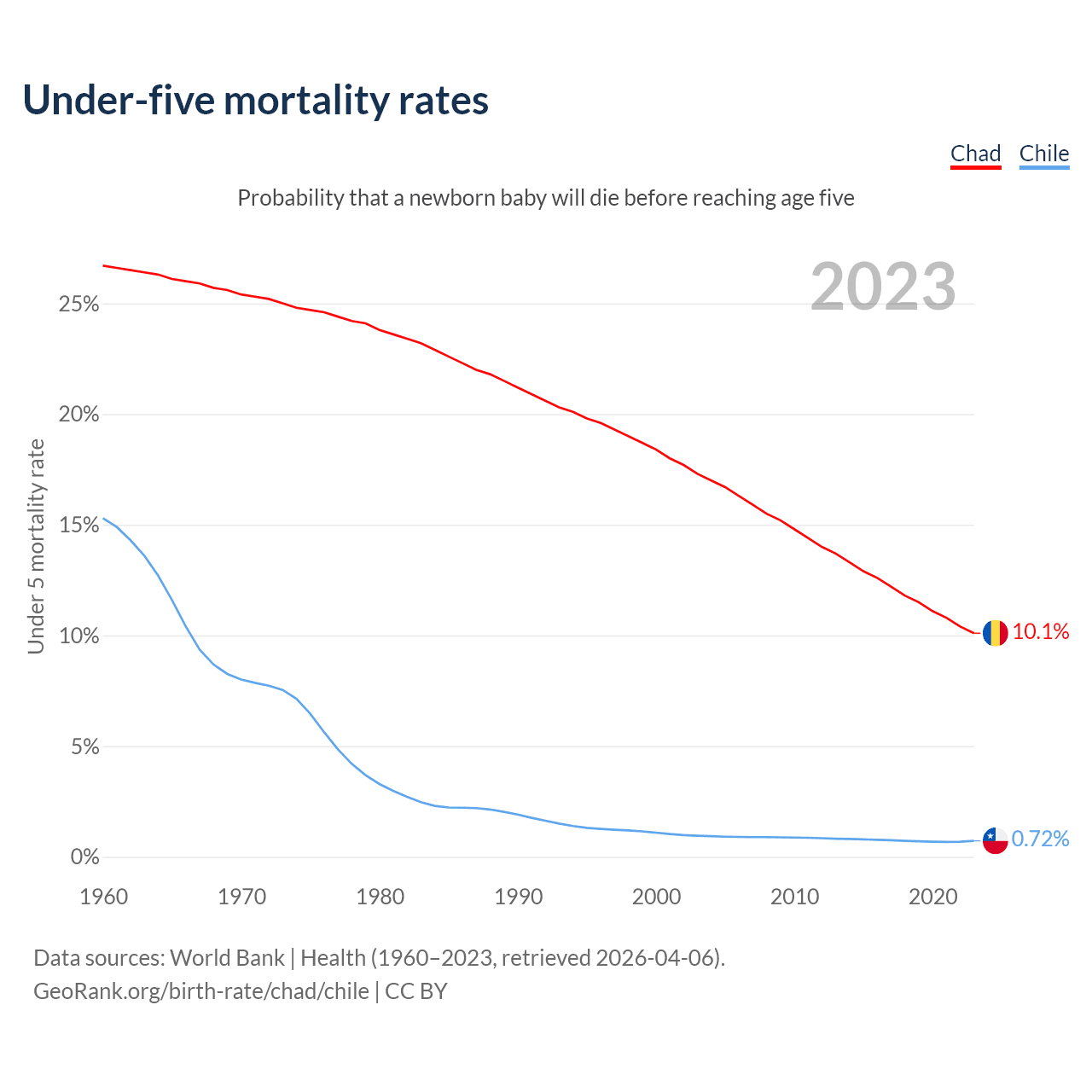 The chance that a newborn baby will die before reaching age five is 10.1% in Chad and 0.72% in Chile. Above is a chart with historical data on under-five mortality rates.