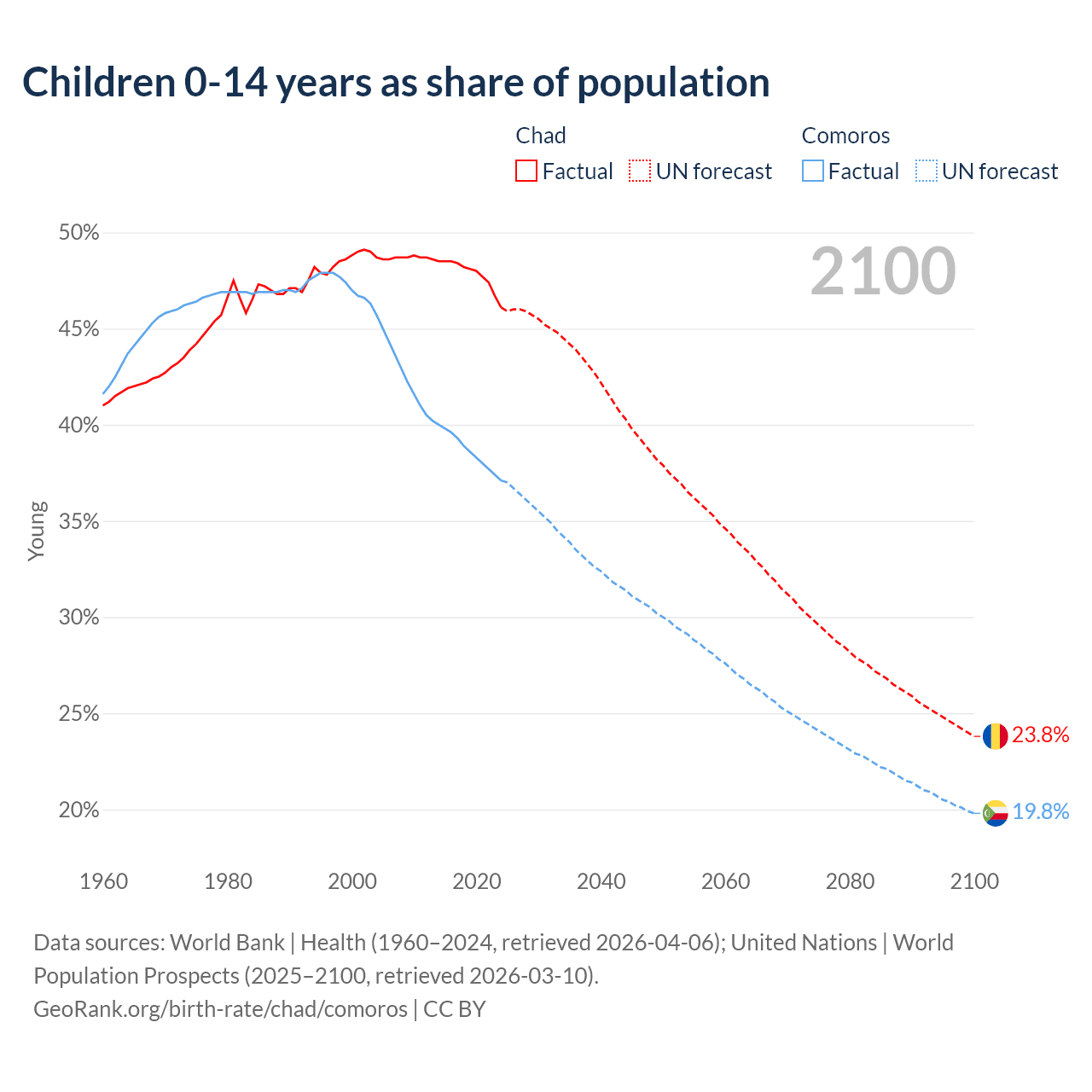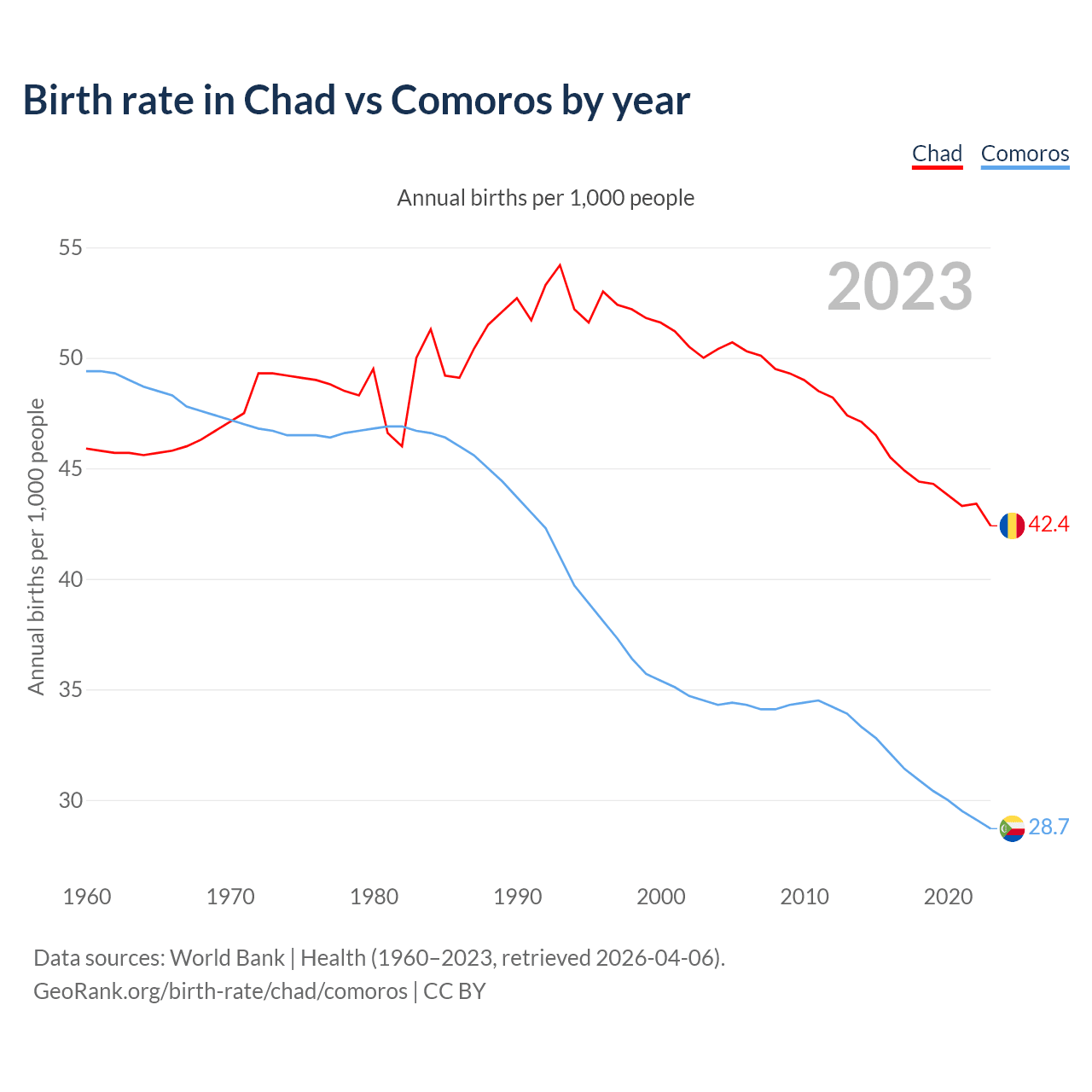 Chad has an annual birth rate of 42.4 births per 1,000 people, compared to 28.7 for Comoros. The average number of children a woman is expected to have during her lifetime — the fertility rate, is 6.12 in Chad and 3.88 in Comoros — 36.6% difference.