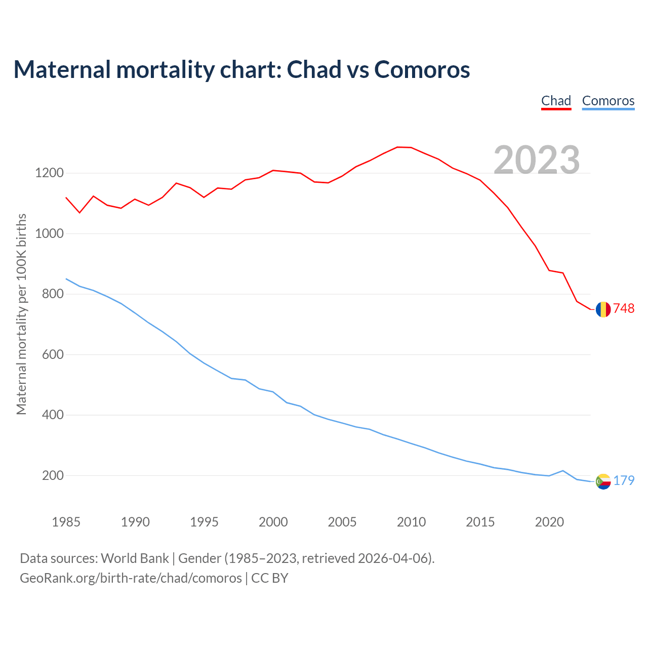 The maternal mortality rate, which is the probability of dying during childbirth or within 42 days of pregnancy termination, is 748 deaths per 100,000 live births in Chad, compared to 179 deaths in Comoros.