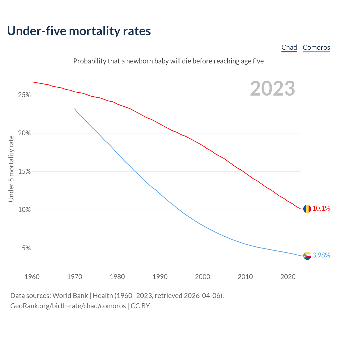 The chance that a newborn baby will die before reaching age five is 10.1% in Chad and 3.98% in Comoros. Above is a chart with historical data on under-five mortality rates.