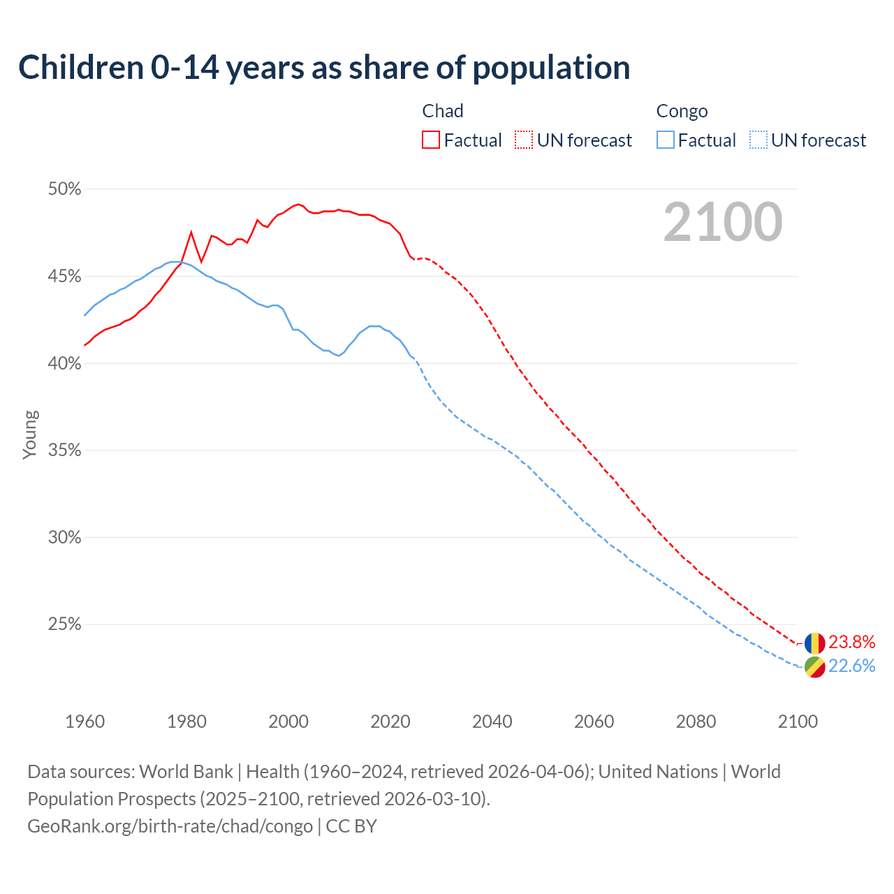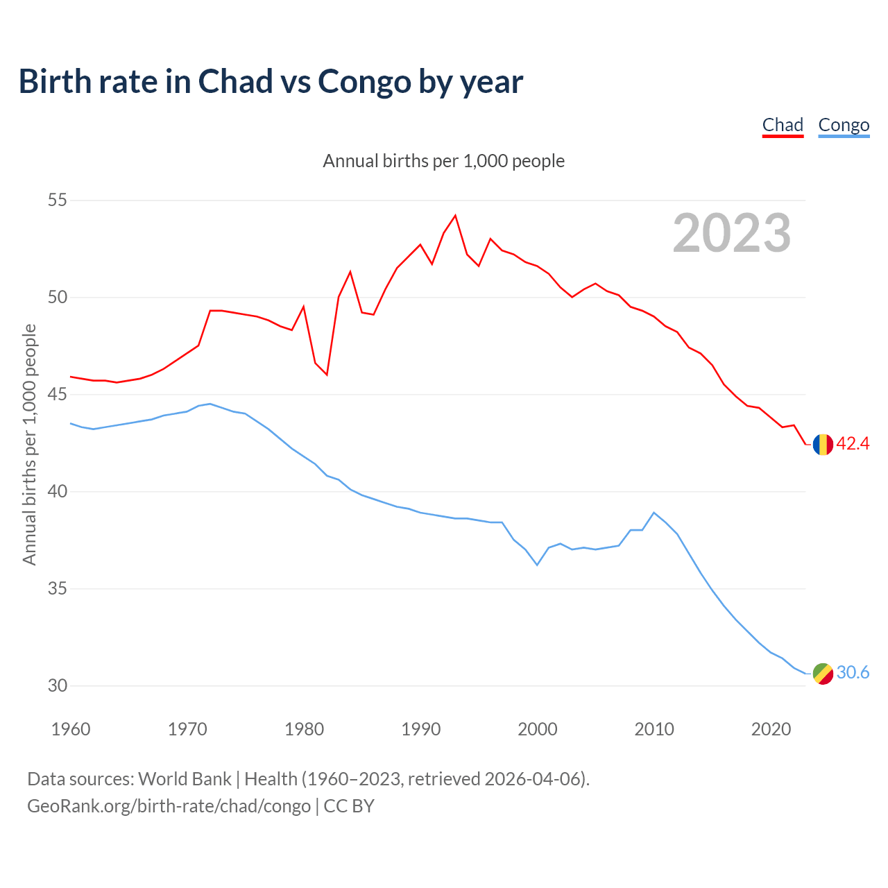 According to the latest available data on birth rates, the fertility rate in Chad was 6.12 children per woman in 2023, compared to 4.16 in the Congo in 2023. The replacement level is considered to be 2.1 children per woman.