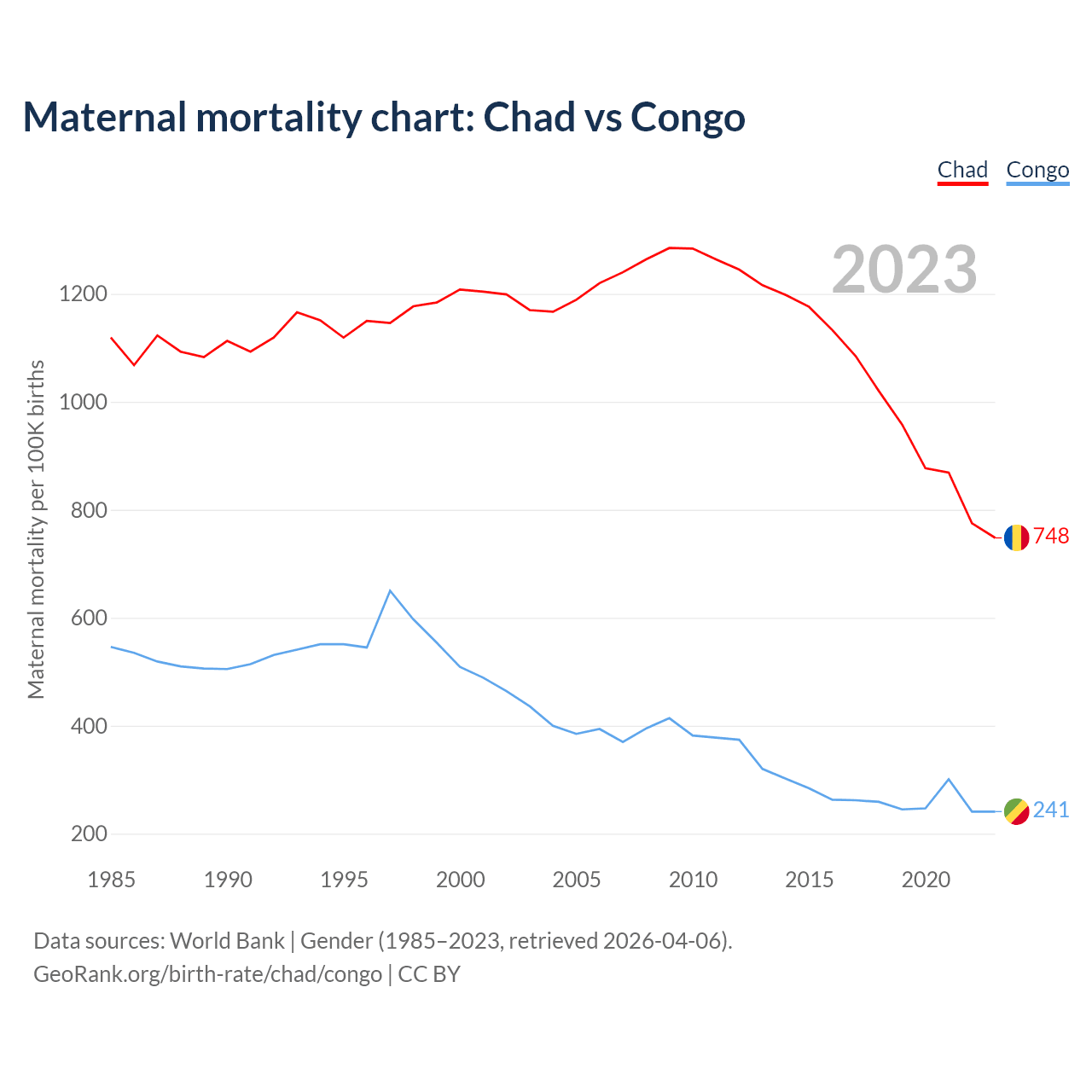 The maternal mortality rate, which is the probability of dying during childbirth or within 42 days of pregnancy termination, is 748 deaths per 100,000 live births in Chad, compared to 241 deaths in the Congo.
