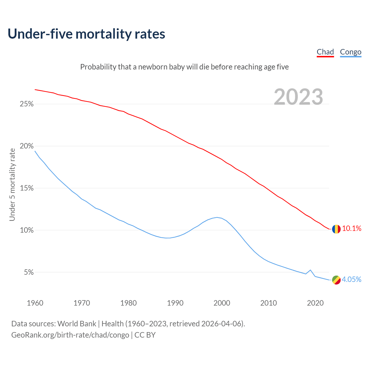 The chance that a newborn baby will die before reaching age five is 10.1% in Chad and 4.05% in the Congo. Above is a chart with historical data on under-five mortality rates.