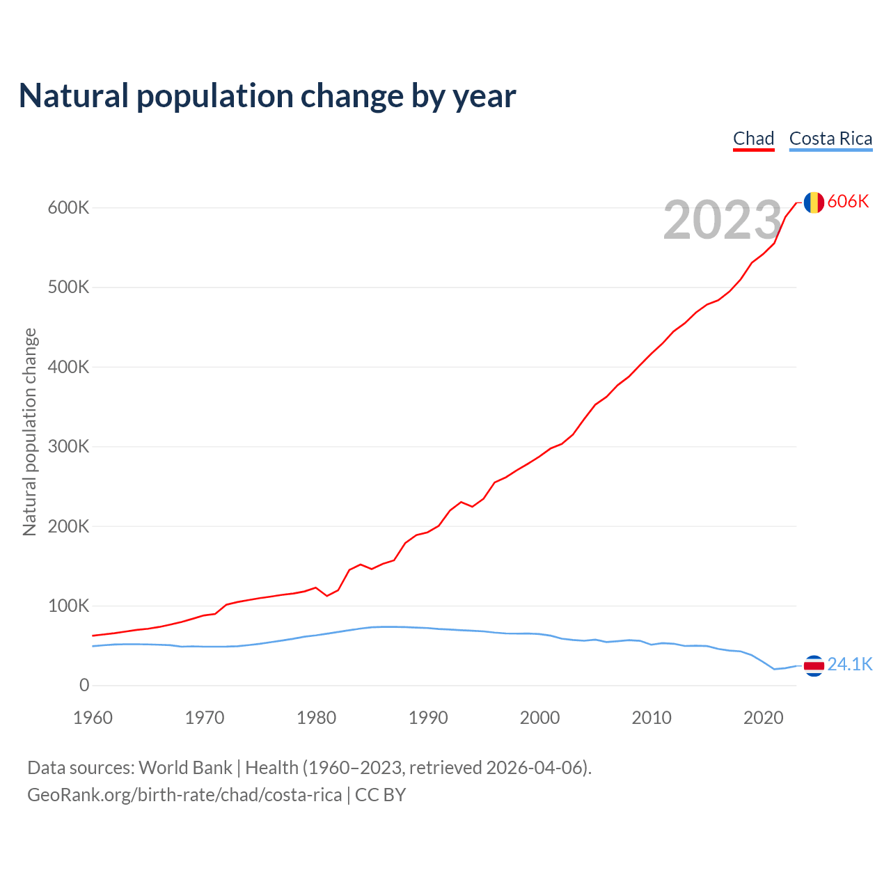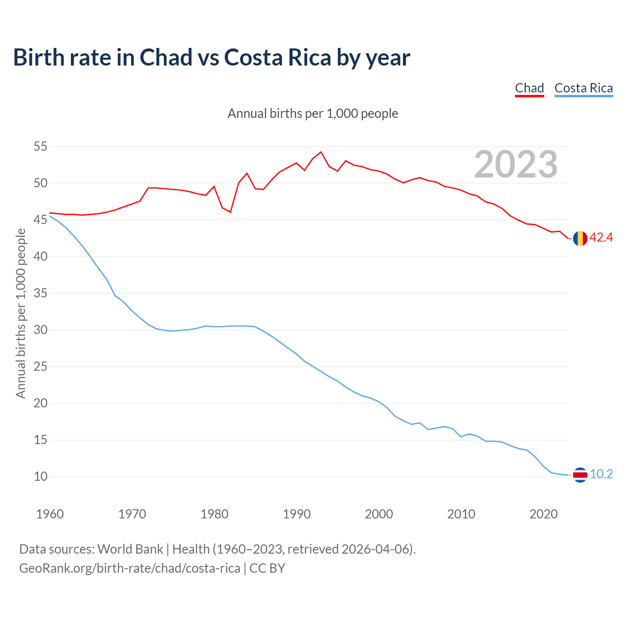 Chad has an annual birth rate of 42.4 births per 1,000 people, compared to 10.2 for Costa Rica. The average number of children a woman is expected to have during her lifetime — the fertility rate, is 6.12 in Chad and 1.33 in Costa Rica — 78.3% difference.