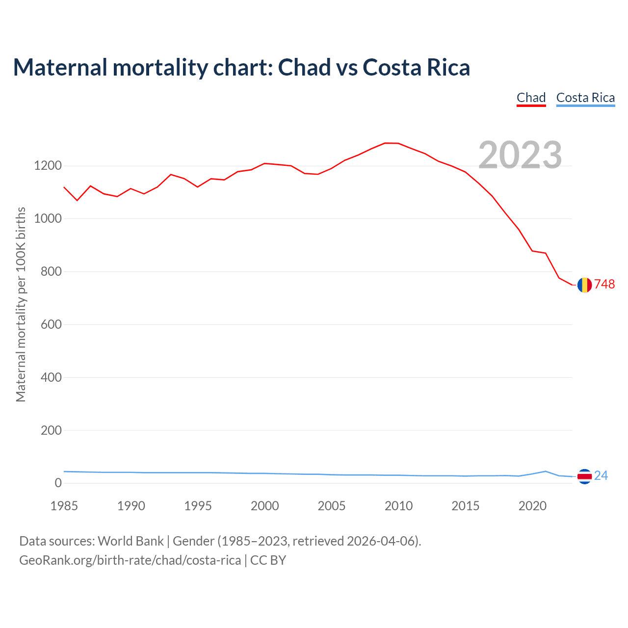 The maternal mortality rate, which is the probability of dying during childbirth or within 42 days of pregnancy termination, is 748 deaths per 100,000 live births in Chad, compared to 24 deaths in Costa Rica.