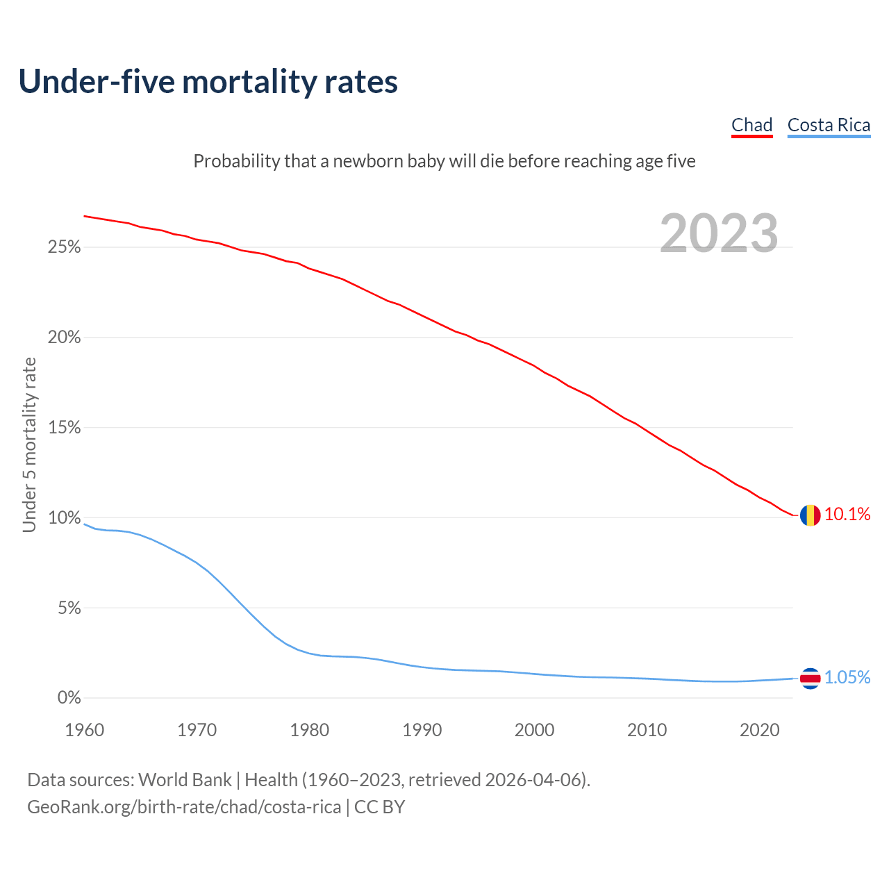 The chance that a newborn baby will die before reaching age five is 10.1% in Chad and 1.05% in Costa Rica. Above is a chart with historical data on under-five mortality rates.