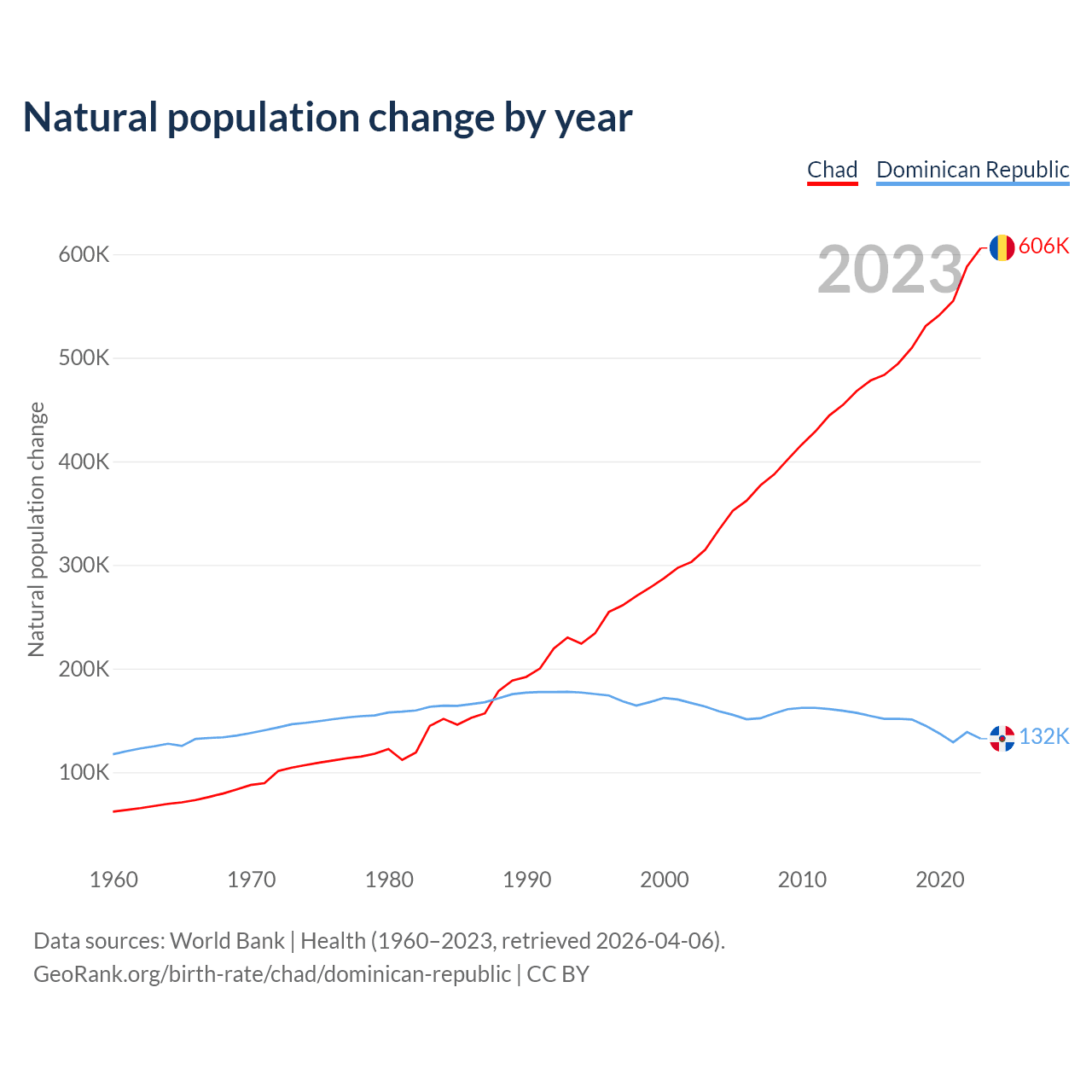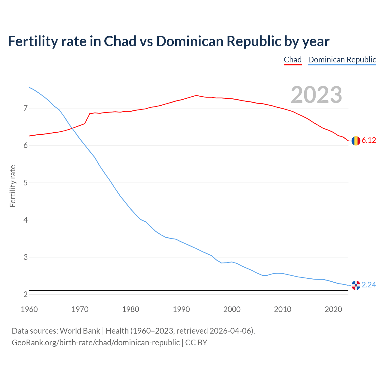 According to the latest available data on birth rates, the fertility rate in Chad was 6.12 children per woman in 2023, compared to 2.24 in the Dominican Republic in 2023. The replacement level is considered to be 2.1 children per woman.
