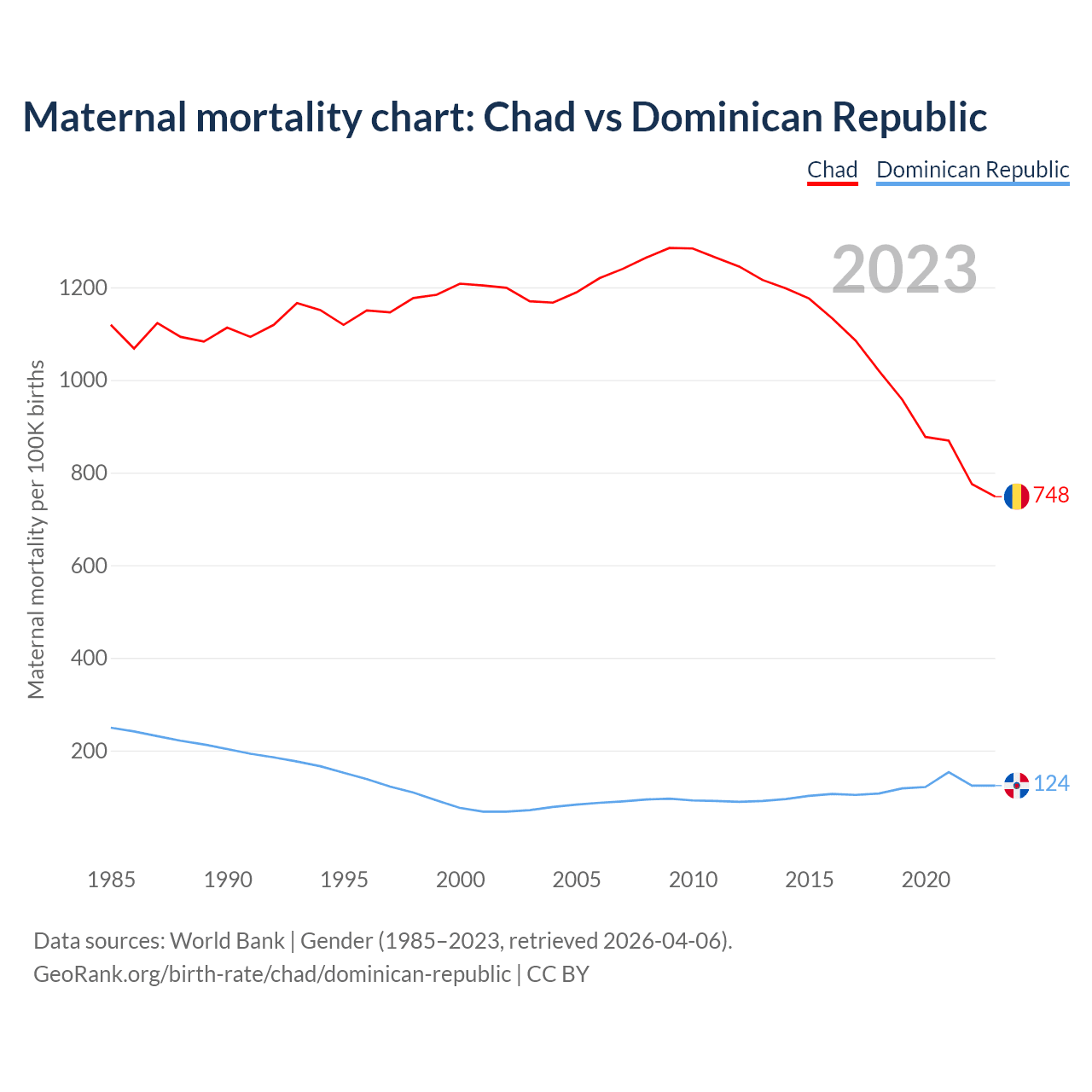 The maternal mortality rate, which is the probability of dying during childbirth or within 42 days of pregnancy termination, is 748 deaths per 100,000 live births in Chad, compared to 124 deaths in the Dominican Republic.