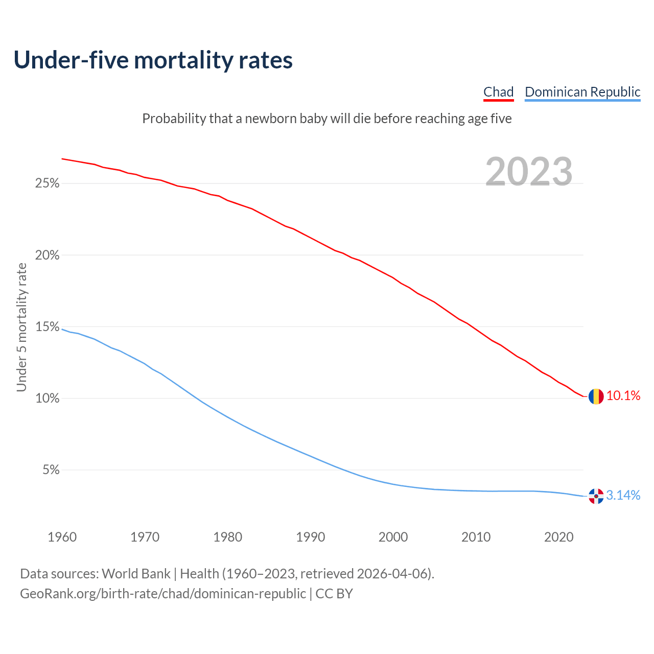The chance that a newborn baby will die before reaching age five is 10.1% in Chad and 3.14% in the Dominican Republic. Above is a chart with historical data on under-five mortality rates.