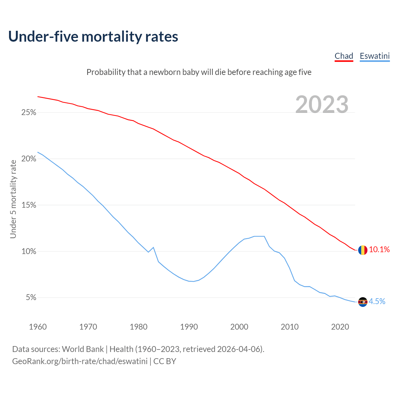 The chance that a newborn baby will die before reaching age five is 10.1% in Chad and 4.5% in Eswatini. Above is a chart with historical data on under-five mortality rates.