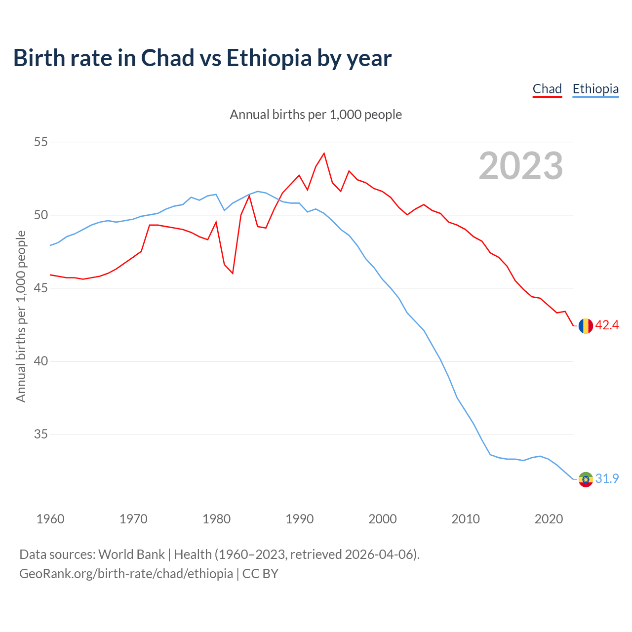 Chad has an annual birth rate of 42.4 births per 1,000 people, compared to 31.9 for Ethiopia. The average number of children a woman is expected to have during her lifetime — the fertility rate, is 6.12 in Chad and 3.99 in Ethiopia — 34.8% difference.