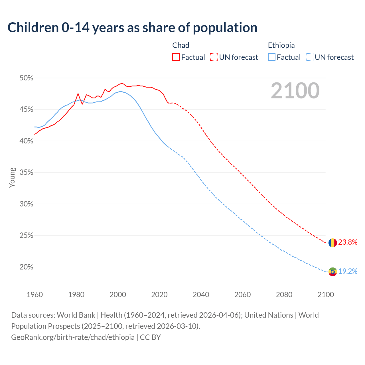 According to the latest available data on birth rates, the fertility rate in Chad was 6.12 children per woman in 2023, compared to 3.99 in Ethiopia in 2023. The replacement level is considered to be 2.1 children per woman.