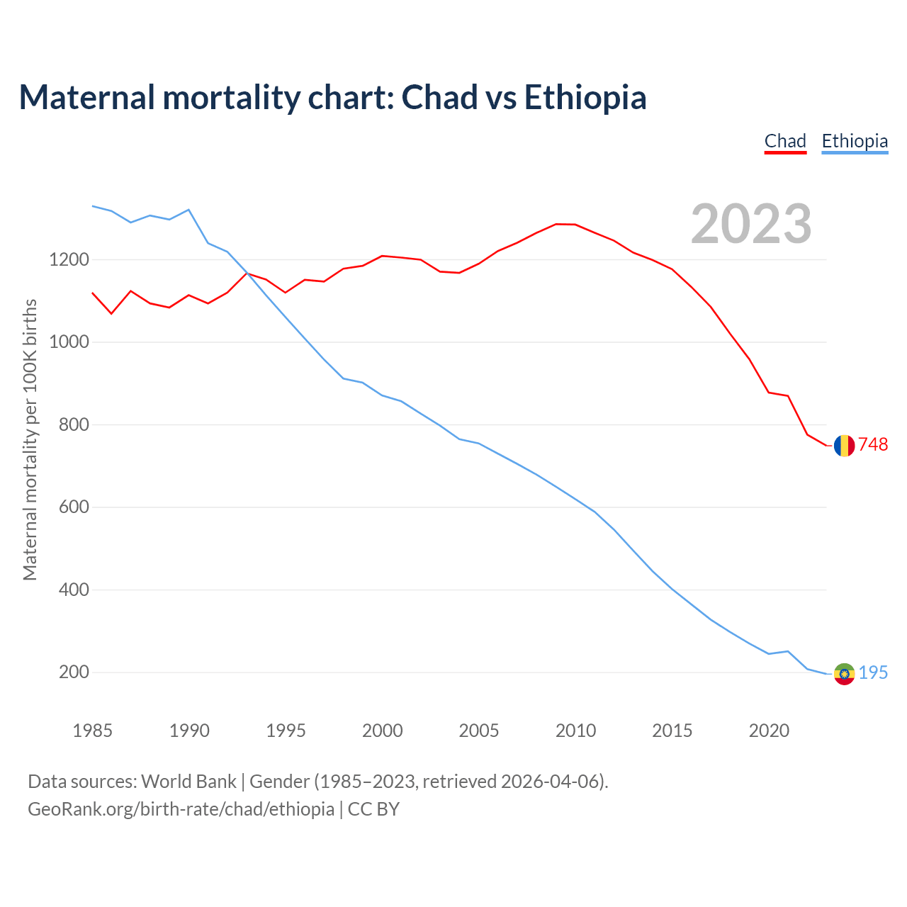 The maternal mortality rate, which is the probability of dying during childbirth or within 42 days of pregnancy termination, is 748 deaths per 100,000 live births in Chad, compared to 195 deaths in Ethiopia.
