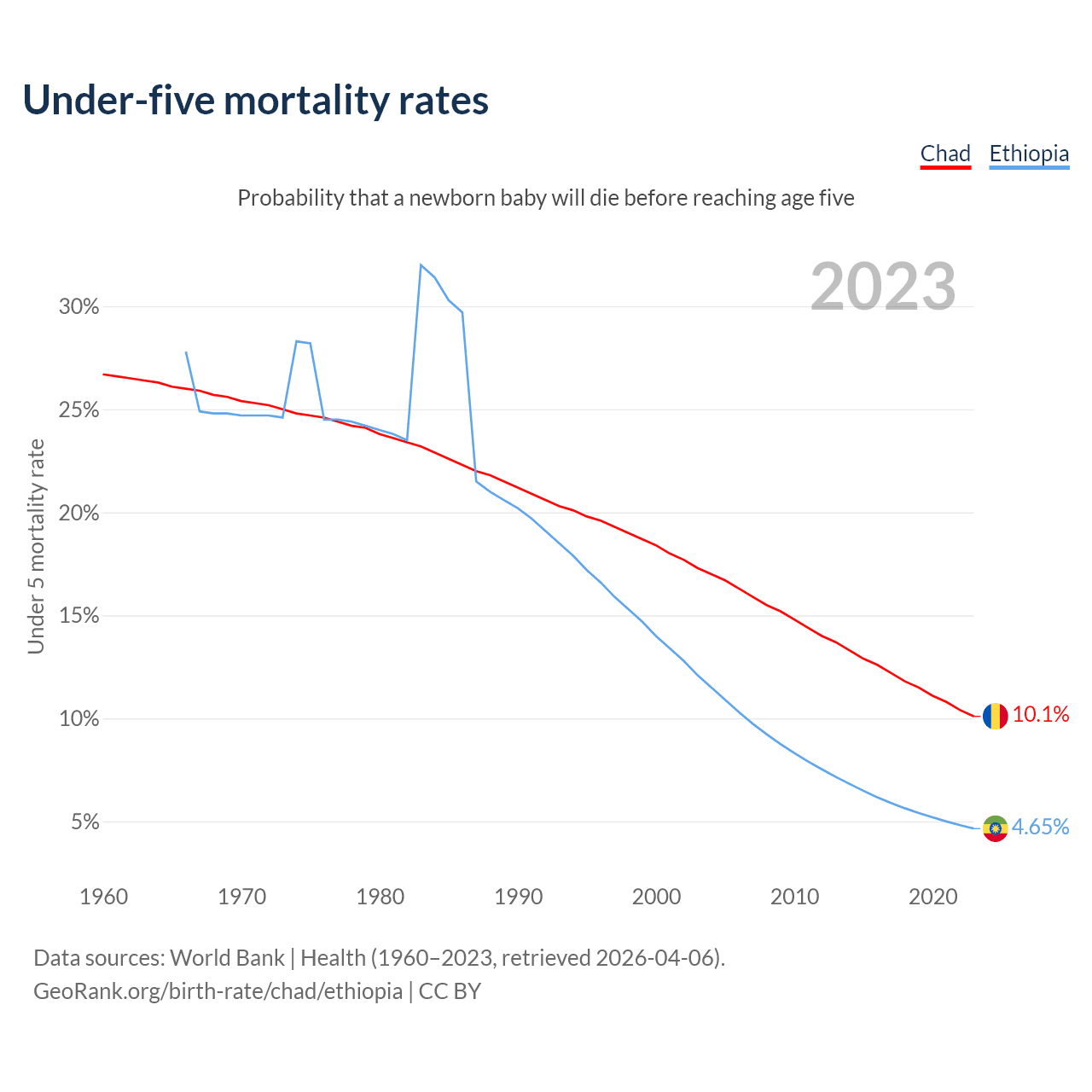 The chance that a newborn baby will die before reaching age five is 10.1% in Chad and 4.65% in Ethiopia. Above is a chart with historical data on under-five mortality rates.