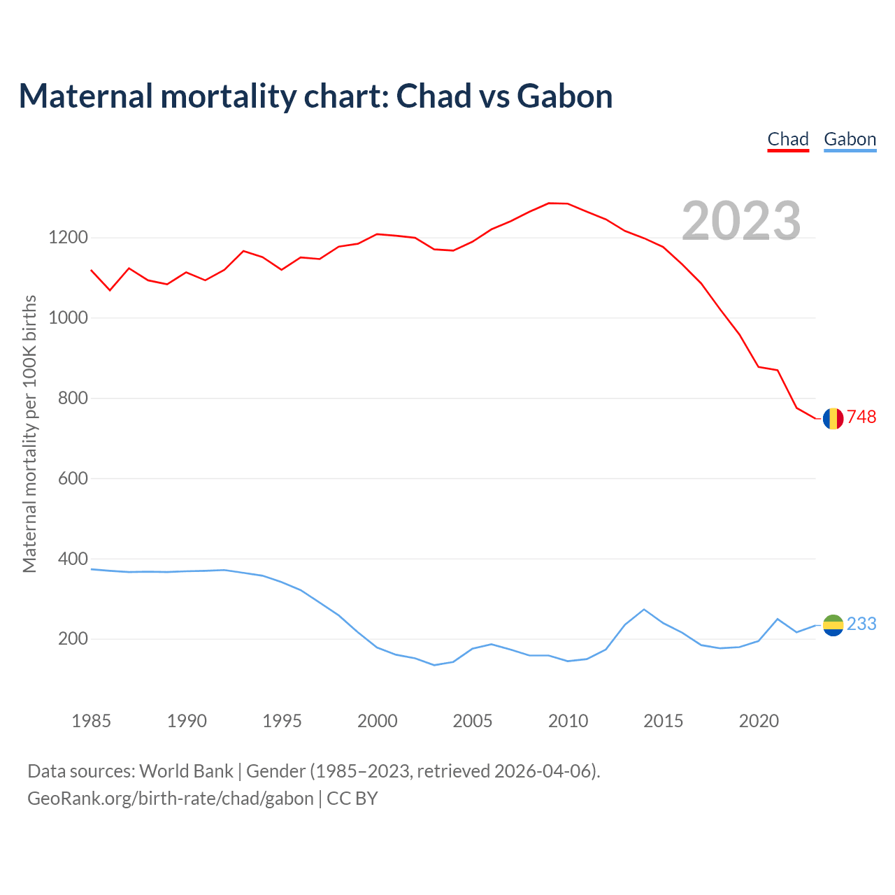 The maternal mortality rate, which is the probability of dying during childbirth or within 42 days of pregnancy termination, is 748 deaths per 100,000 live births in Chad, compared to 233 deaths in Gabon.