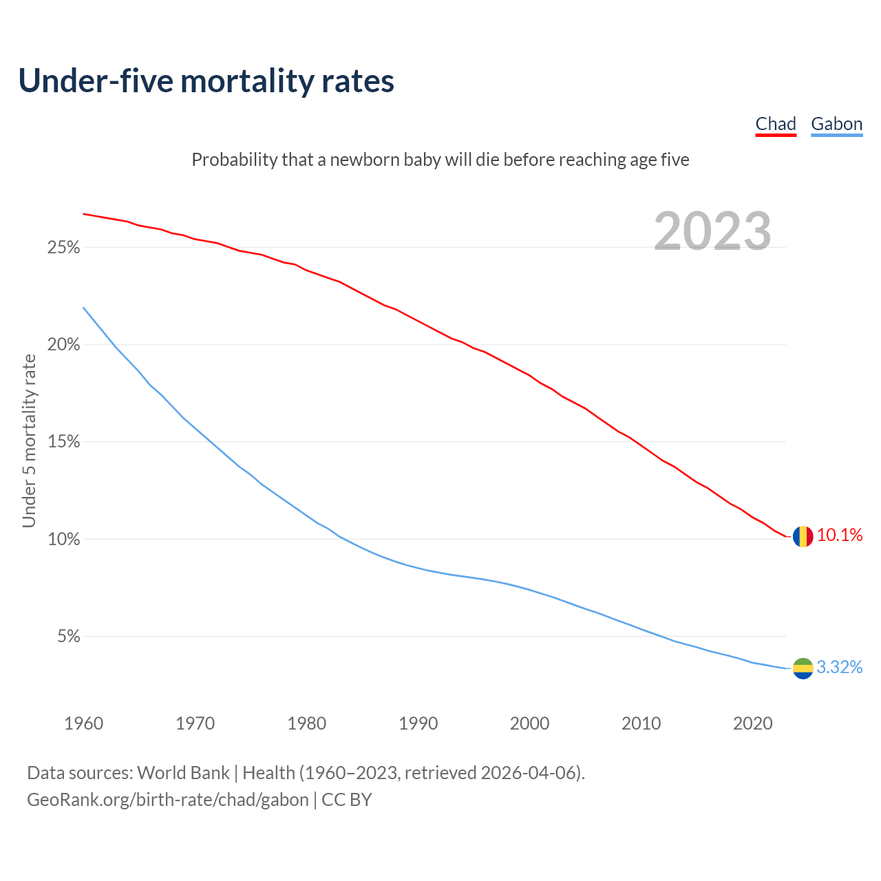The chance that a newborn baby will die before reaching age five is 10.1% in Chad and 3.32% in Gabon. Above is a chart with historical data on under-five mortality rates.