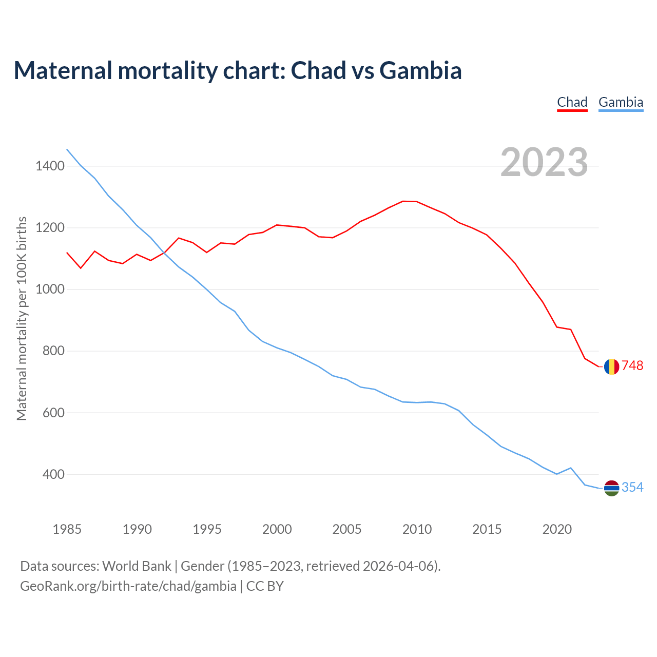 The maternal mortality rate, which is the probability of dying during childbirth or within 42 days of pregnancy termination, is 748 deaths per 100,000 live births in Chad, compared to 354 deaths in the Gambia.