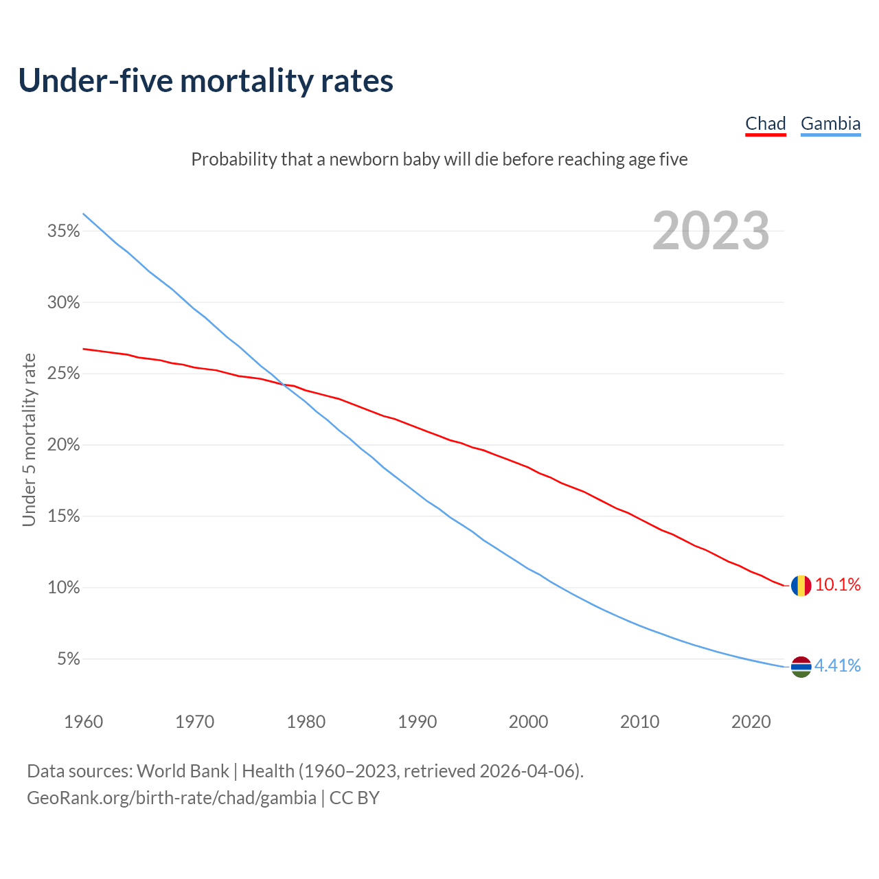 The chance that a newborn baby will die before reaching age five is 10.1% in Chad and 4.41% in the Gambia. Above is a chart with historical data on under-five mortality rates.