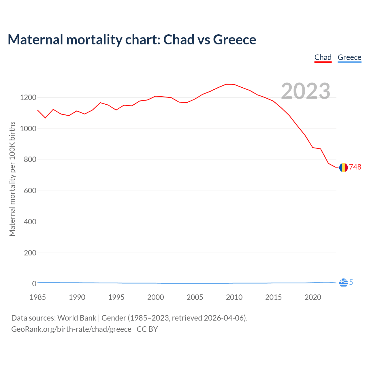 The maternal mortality rate, which is the probability of dying during childbirth or within 42 days of pregnancy termination, is 748 deaths per 100,000 live births in Chad, compared to 5 deaths in Greece.
