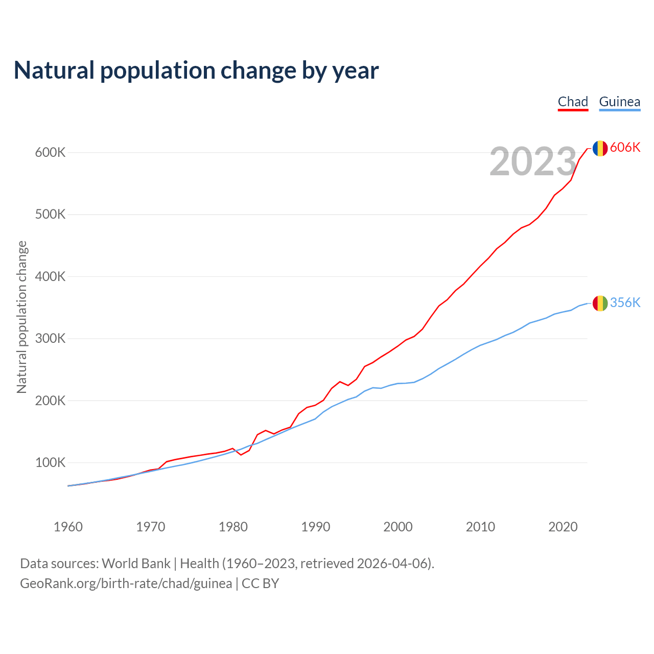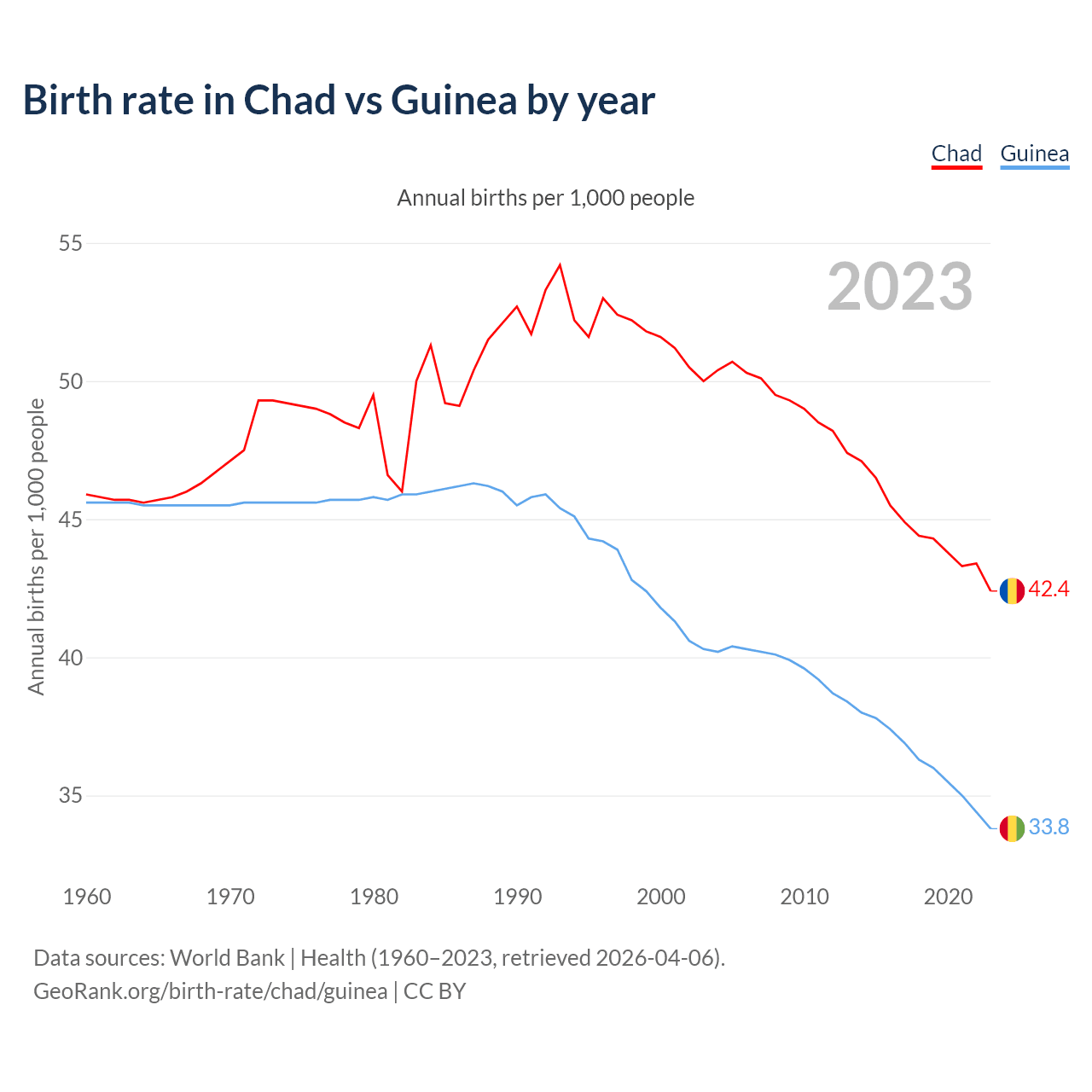 According to the latest available data on birth rates, the fertility rate in Chad was 6.12 children per woman in 2023, compared to 4.22 in Guinea in 2023. The replacement level is considered to be 2.1 children per woman.
