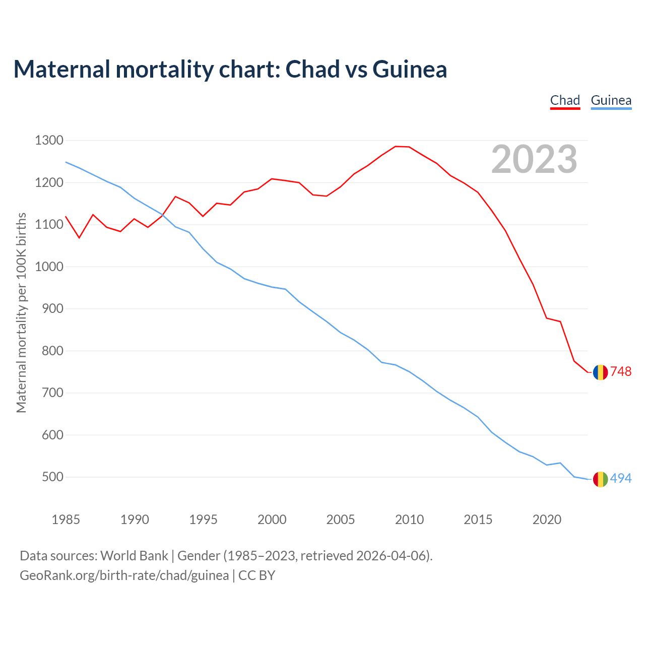 The maternal mortality rate, which is the probability of dying during childbirth or within 42 days of pregnancy termination, is 748 deaths per 100,000 live births in Chad, compared to 494 deaths in Guinea.