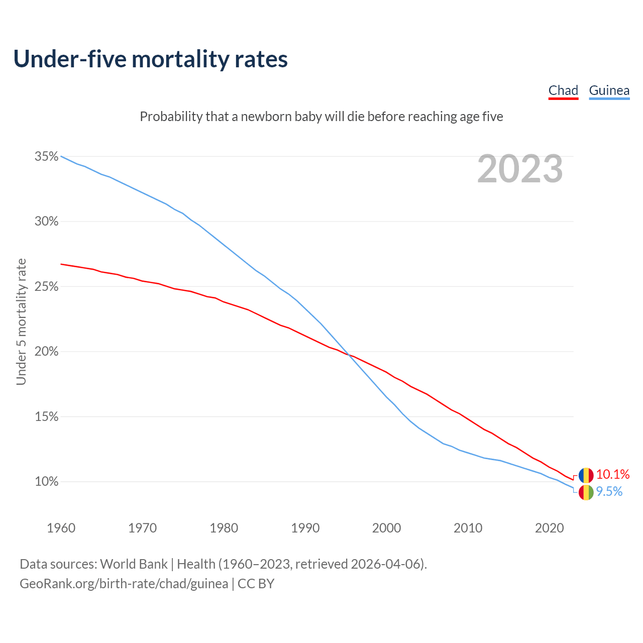 The chance that a newborn baby will die before reaching age five is 10.1% in Chad and 9.5% in Guinea. Above is a chart with historical data on under-five mortality rates.
