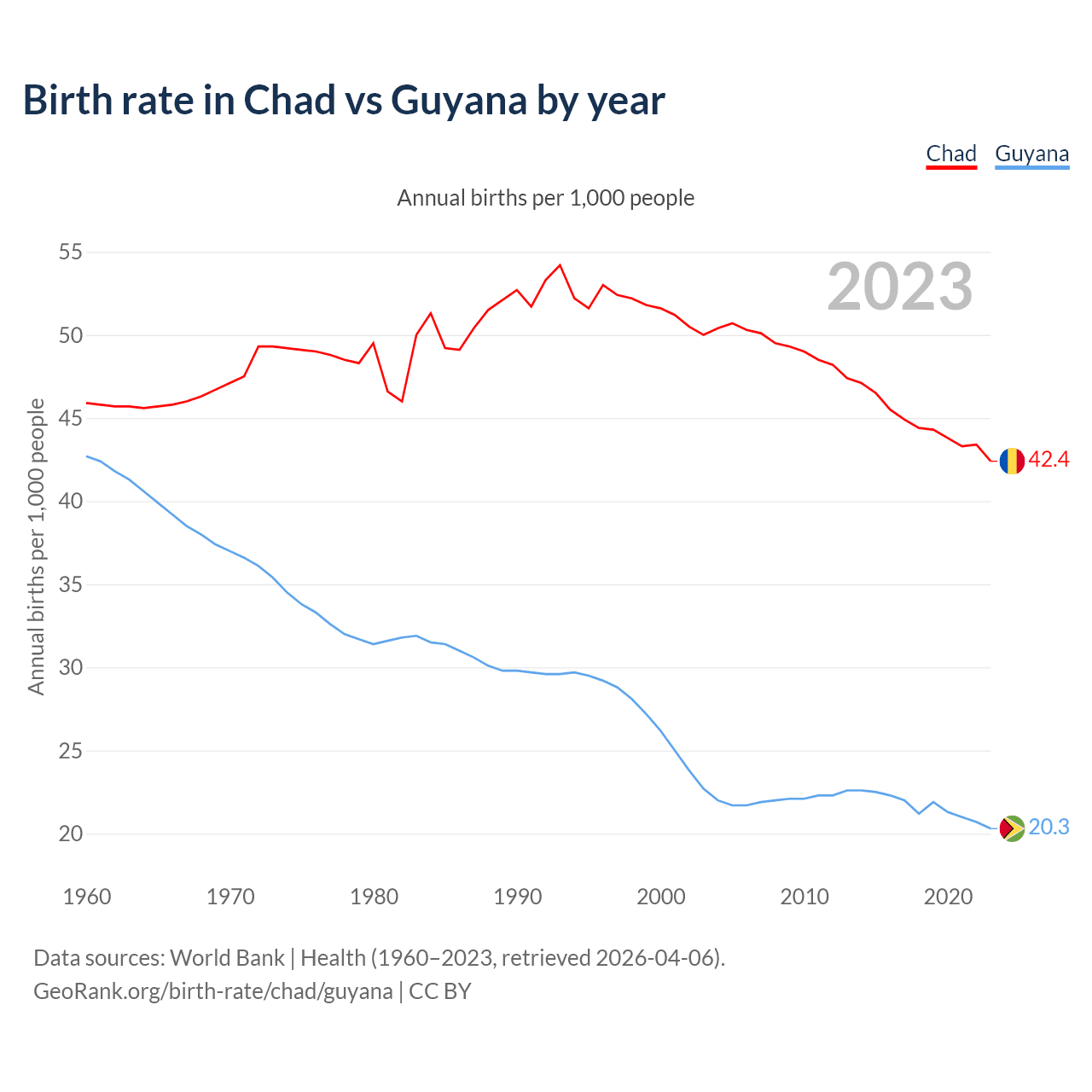 Chad has an annual birth rate of 42.4 births per 1,000 people, compared to 20.3 for Guyana. The average number of children a woman is expected to have during her lifetime — the fertility rate, is 6.12 in Chad and 2.41 in Guyana — 60.6% difference.