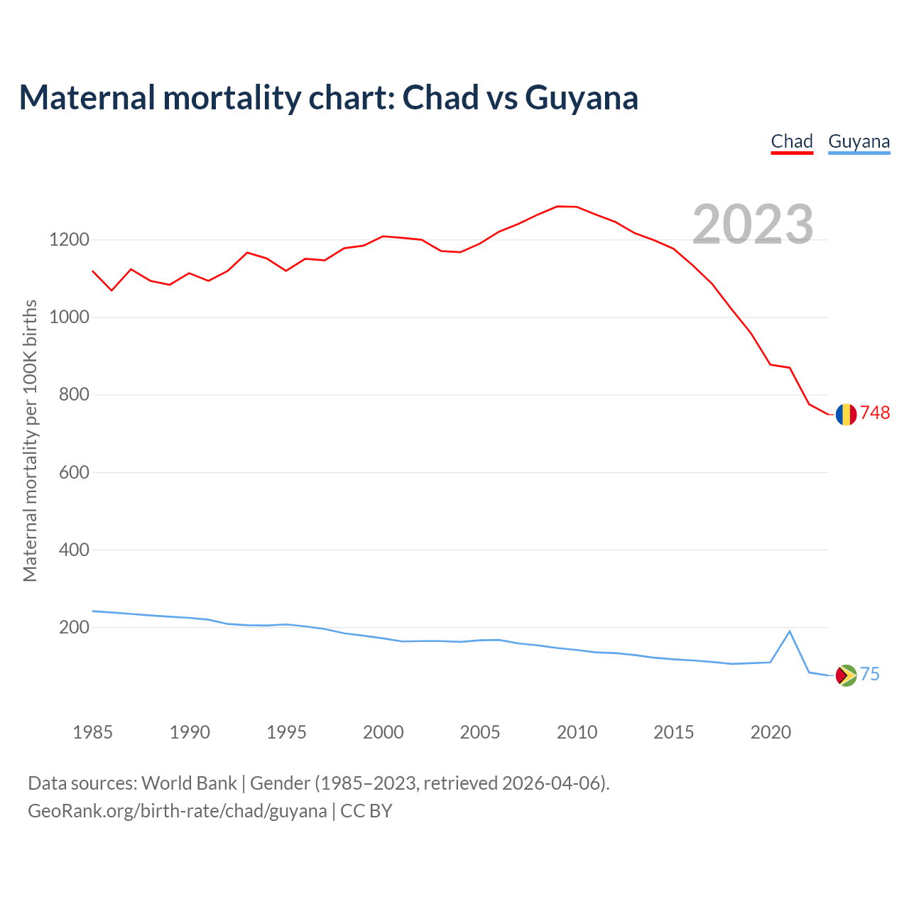 The maternal mortality rate, which is the probability of dying during childbirth or within 42 days of pregnancy termination, is 748 deaths per 100,000 live births in Chad, compared to 75 deaths in Guyana.