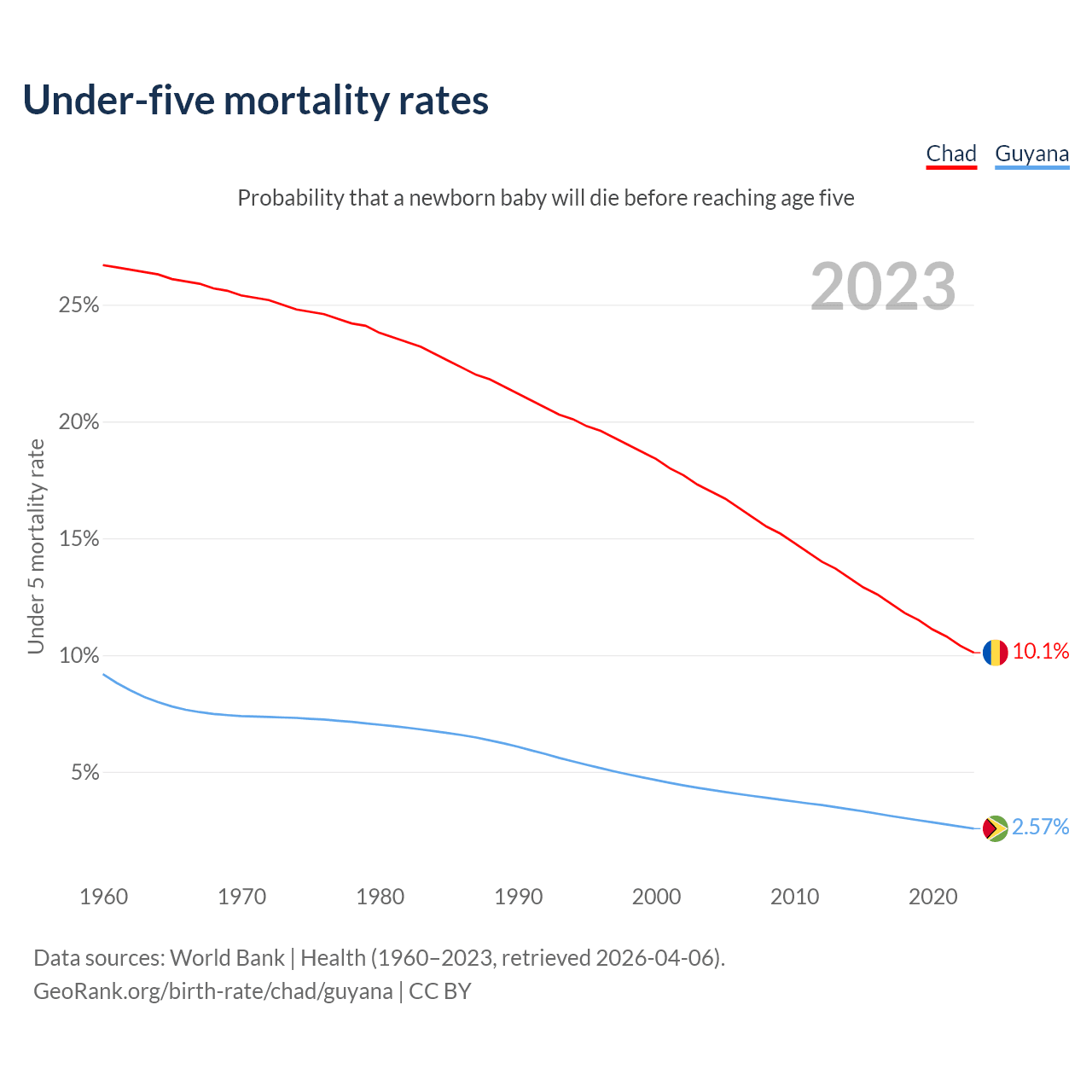 The chance that a newborn baby will die before reaching age five is 10.1% in Chad and 2.57% in Guyana. Above is a chart with historical data on under-five mortality rates.
