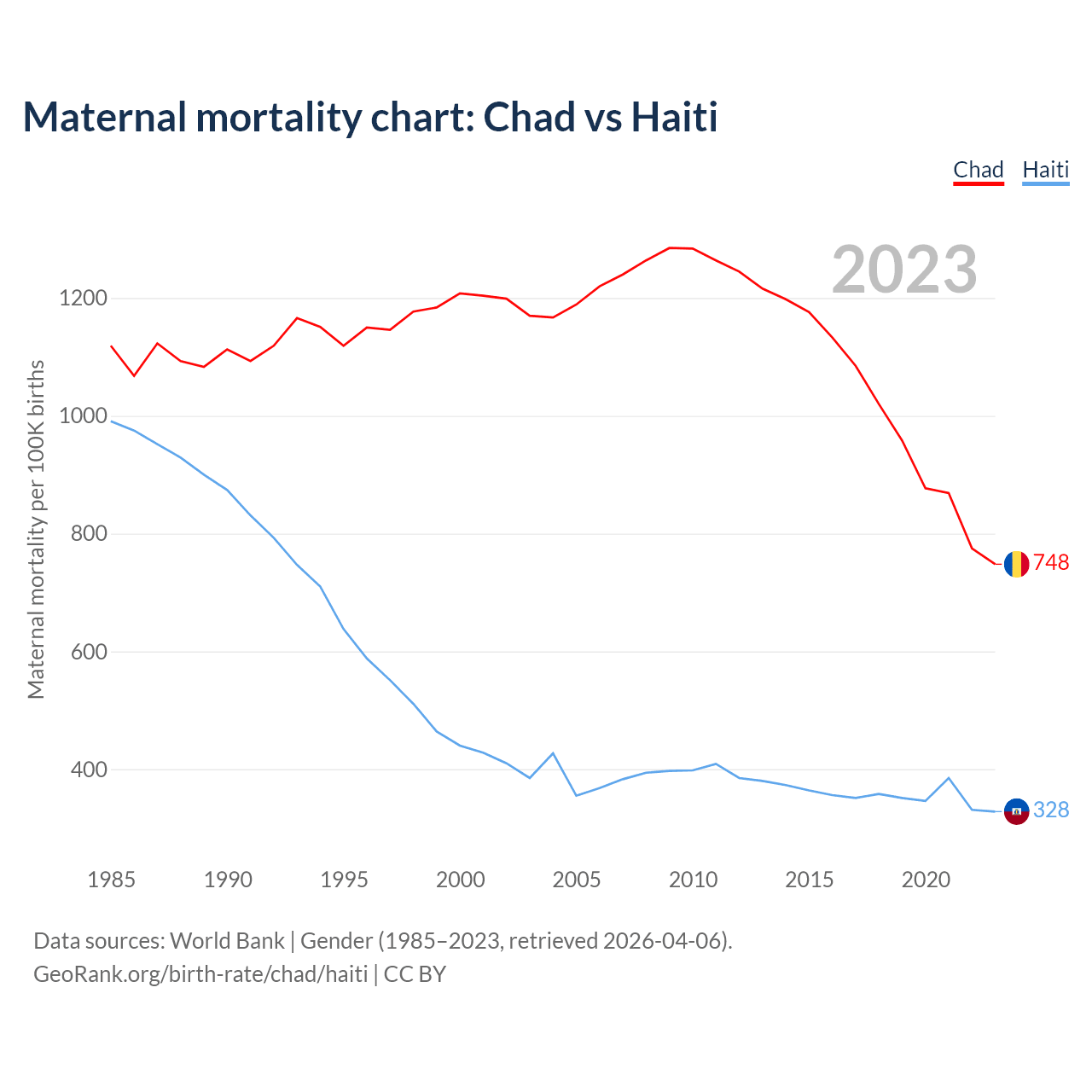 The maternal mortality rate, which is the probability of dying during childbirth or within 42 days of pregnancy termination, is 748 deaths per 100,000 live births in Chad, compared to 328 deaths in Haiti.