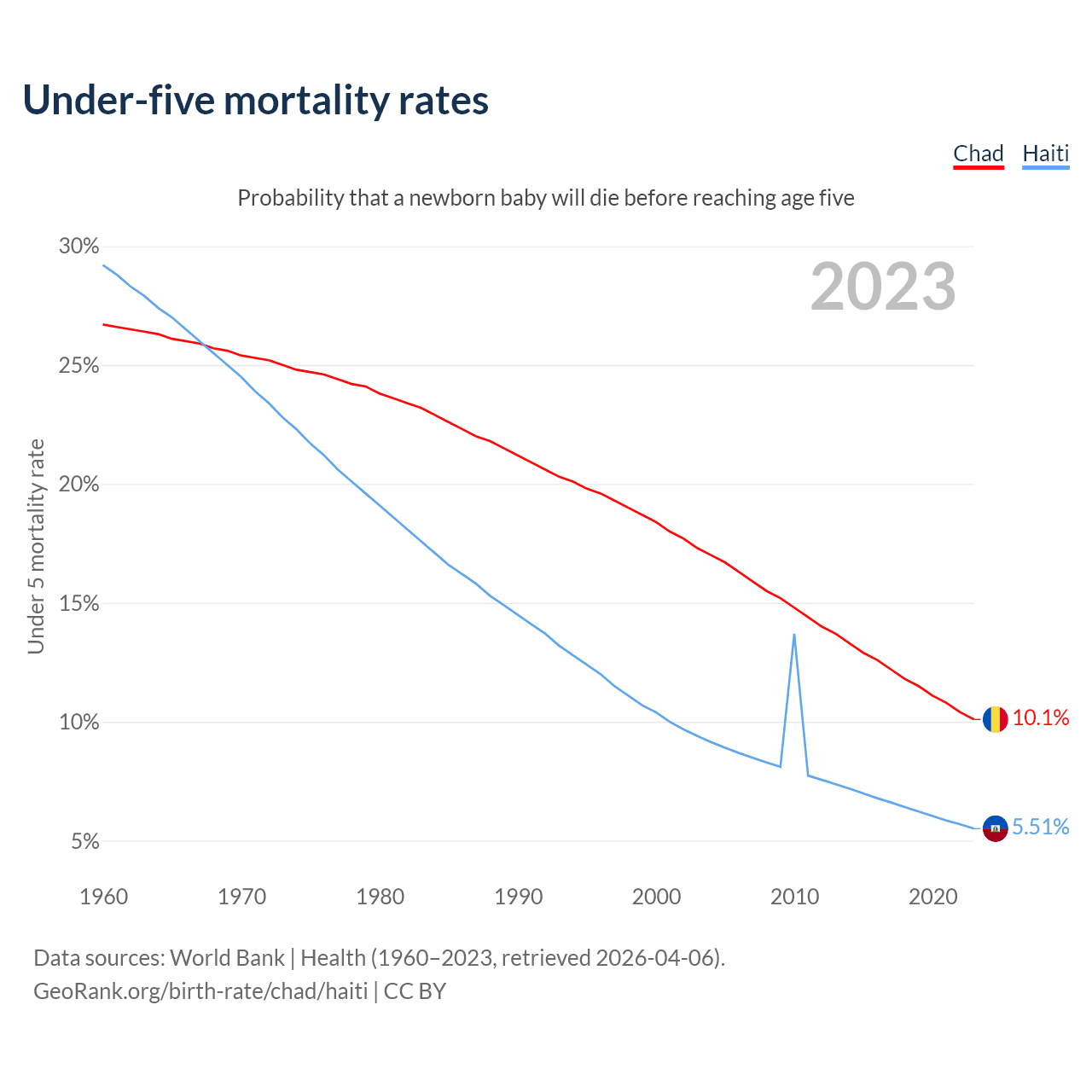 The chance that a newborn baby will die before reaching age five is 10.1% in Chad and 5.51% in Haiti. Above is a chart with historical data on under-five mortality rates.