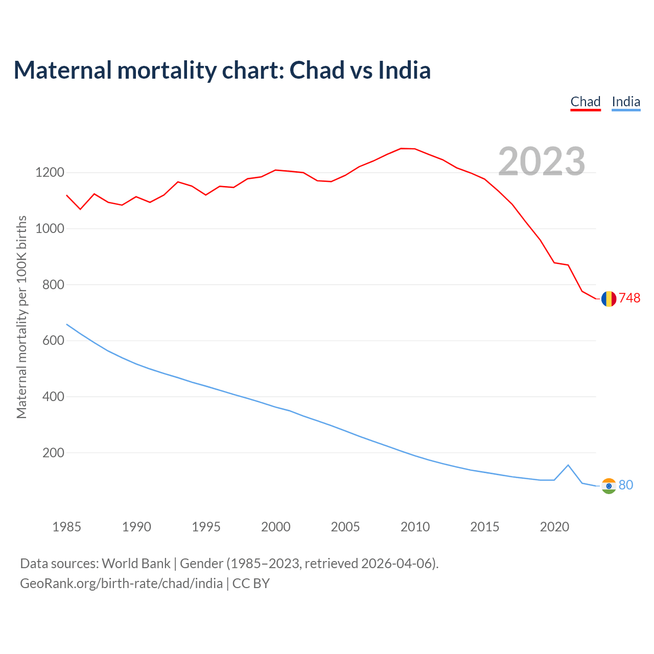 The maternal mortality rate, which is the probability of dying during childbirth or within 42 days of pregnancy termination, is 748 deaths per 100,000 live births in Chad, compared to 80 deaths in India.