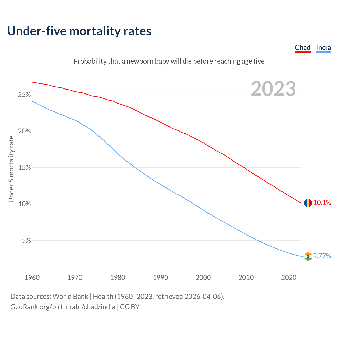 The chance that a newborn baby will die before reaching age five is 10.1% in Chad and 2.77% in India. Above is a chart with historical data on under-five mortality rates.